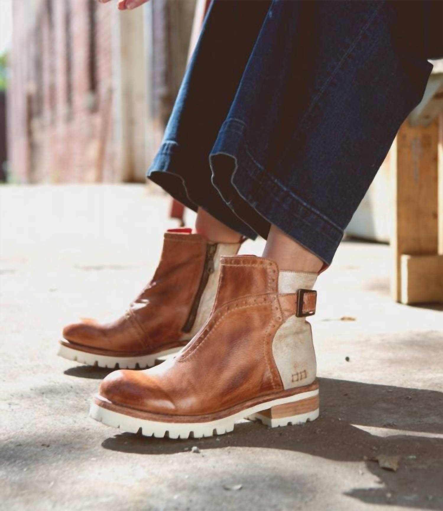 Say hello to the perfect, most versatile boot. The ankle height makes this style easily transition from day to night. Wear them with your favorite skinny jeans and tee for a more laid back look, or pair them with your favorite mini dress and jacket for a night out on the town.The Women's Brianna Leather Boots by BEDSTU combine style and comfort with their vegetable tanned leather in Tan Rustic Nectar Lux. These ankle boots feature circular perforations, contrast topstitching, and a polished YKK inner zipper for easy wear, along with an adjustable ankle buckle. The 1.5-inch block heel and 1-inch platform ensure all-day wearability with an XL EXTRALIGHT flexible and shock-absorbing lug outsole. Handmade in Leon, Mexico, these boots are lined with red leather and offer a padded insole for added comfort.