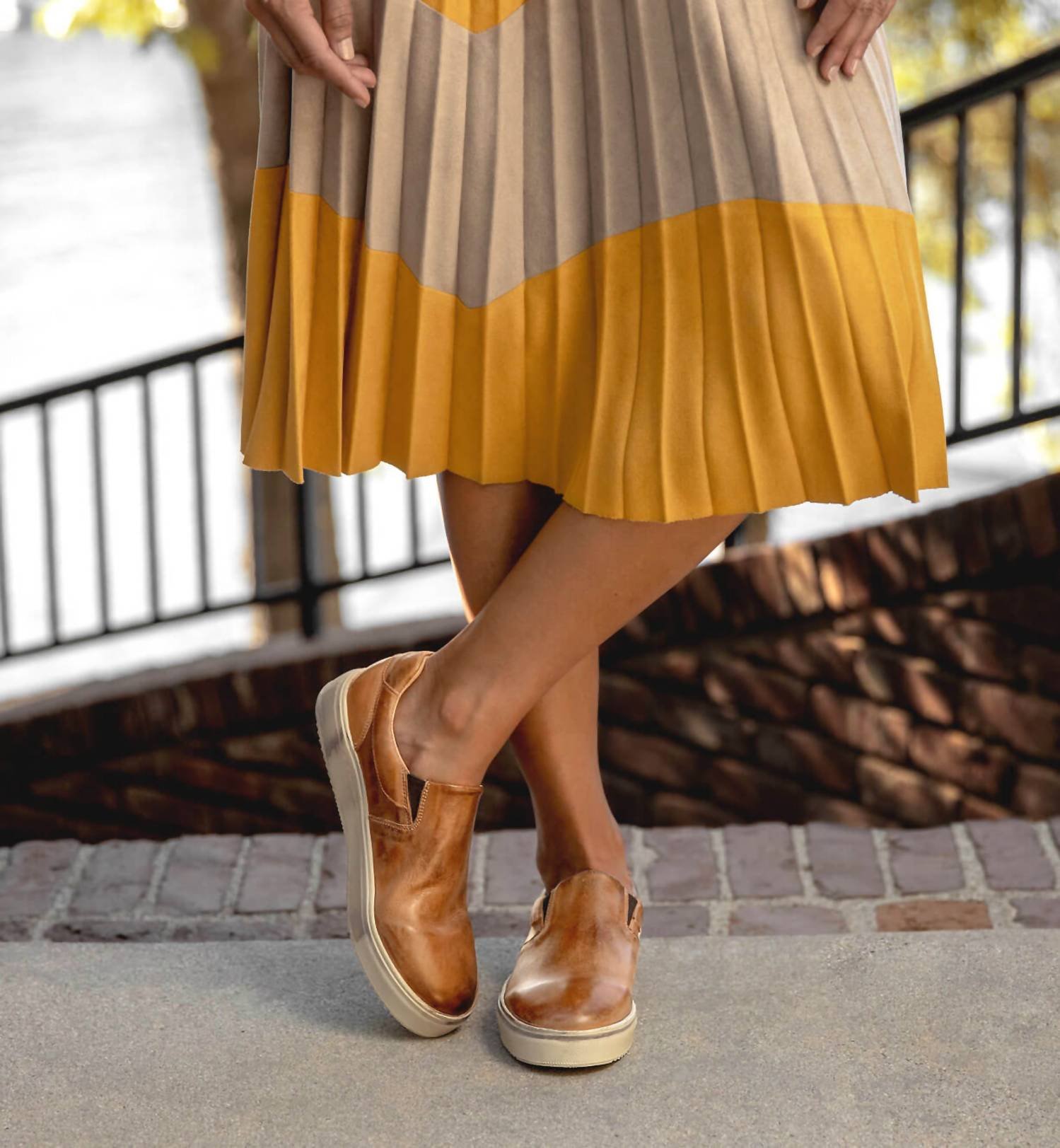 Introducing the Hermione Slip On Sneaker by BEDSTU, crafted in Tan Rustic Mason Bfs for the fashion-forward explorer. These women's sneakers feature a round toe design with a flat heel under 1', perfect for minimalist spring travel. Made from chrome-free, vegetable-tanned leather and expertly handmade in Leon, Mexico, these sneakers boast a durable white LIVETECH sole. The slip-on style with goring for stretch and a padded collar ensures all-day comfort.