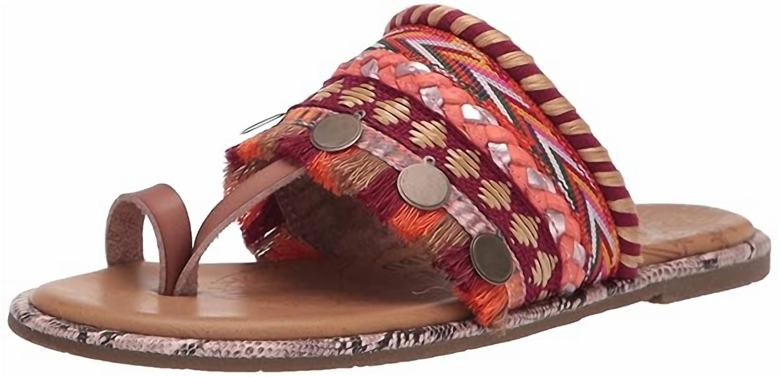 Classicly cute and all-day-wearable. We love this sandal.Moroccan-inspired slip-on flat sandals with faux leather sole and toe strap. Features intricate stitching details for added style.