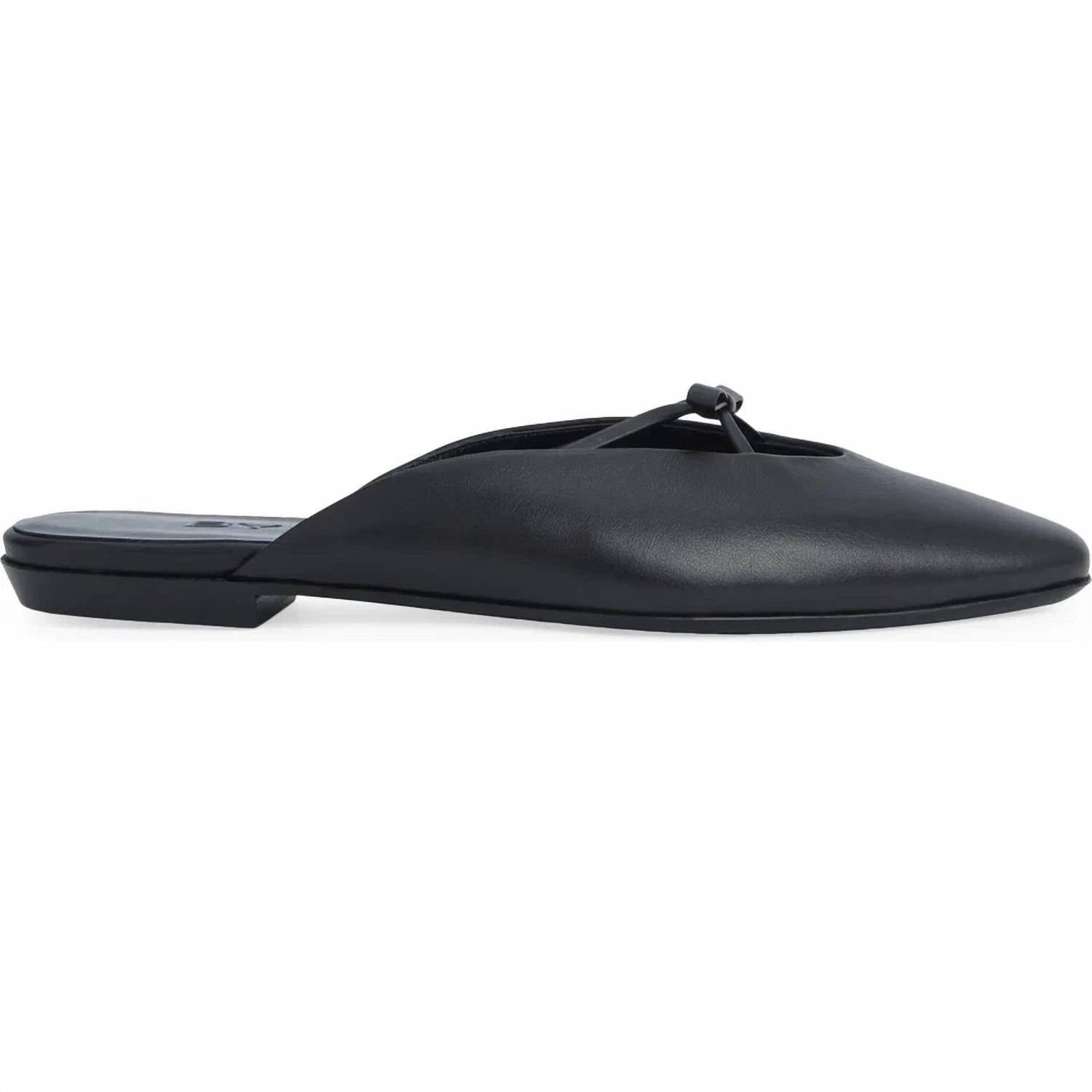 A trend that everyone is loving and this style might just be our favorite.Step into elegance with the Women's Finn Leather Bow Ballerina Mules by BY FAR, crafted in classic black. These mules feature a playful ballerina vibe with an almond toe and bow detailing, enhanced by cut-out accents. Composed of a leather upper, branded leather insole, and rubber sole, these flats promise both style and comfort. Made in Portugal, these minimalist mules are perfect for church and other formal occasions.