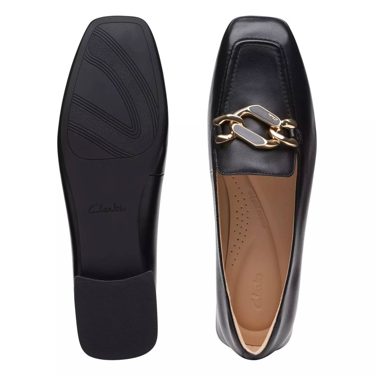 Loafers so versatile you can wear them with just about anything.Elevate your workwear with the Women's Ubree 15 Trim Leather Loafer by Clarks, a timeless classic in sleek black leather. This loafer features a sophisticated square toe and offers a lightweight profile that promises comfort for days spent on your feet. Material: Leather upper with a man-made balance. Enjoy the comfort of a Molded Contour Cushion footbed with a modest approximately 5/8-inch heel.