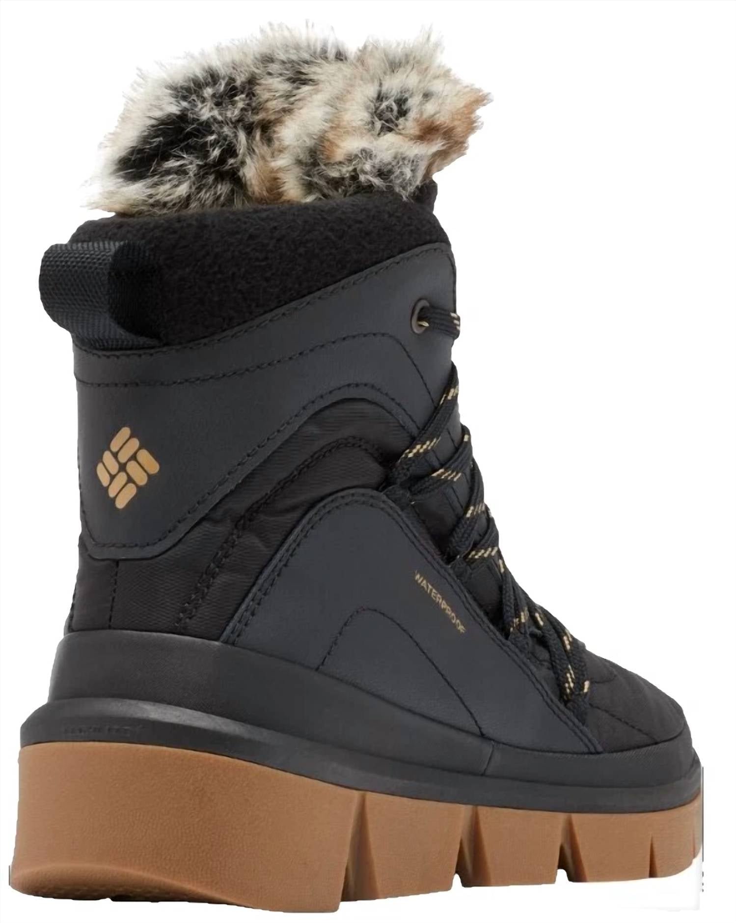 Rainy day No problem! The cutest and most comfortable rainboots of the season.Meet the Women's Keetley Shorty Snow Boot by Columbia in a chic Black/Sahara color, a stylish winter essential providing maximum protection from the elements. Featuring a waterproof textile upper with leather overlays and a cozy fleece and faux fur collar, it ensures comfort and warmth. The lace closure provides a secure fit, while the TECHLITE+ cushioning and 200g insulation offer responsive comfort. With Omni-HEAT Infinity reflective lining for warmth retention and ADAPT TRAX outsole for superior traction, this boot is designed for durability and performance in any weather.