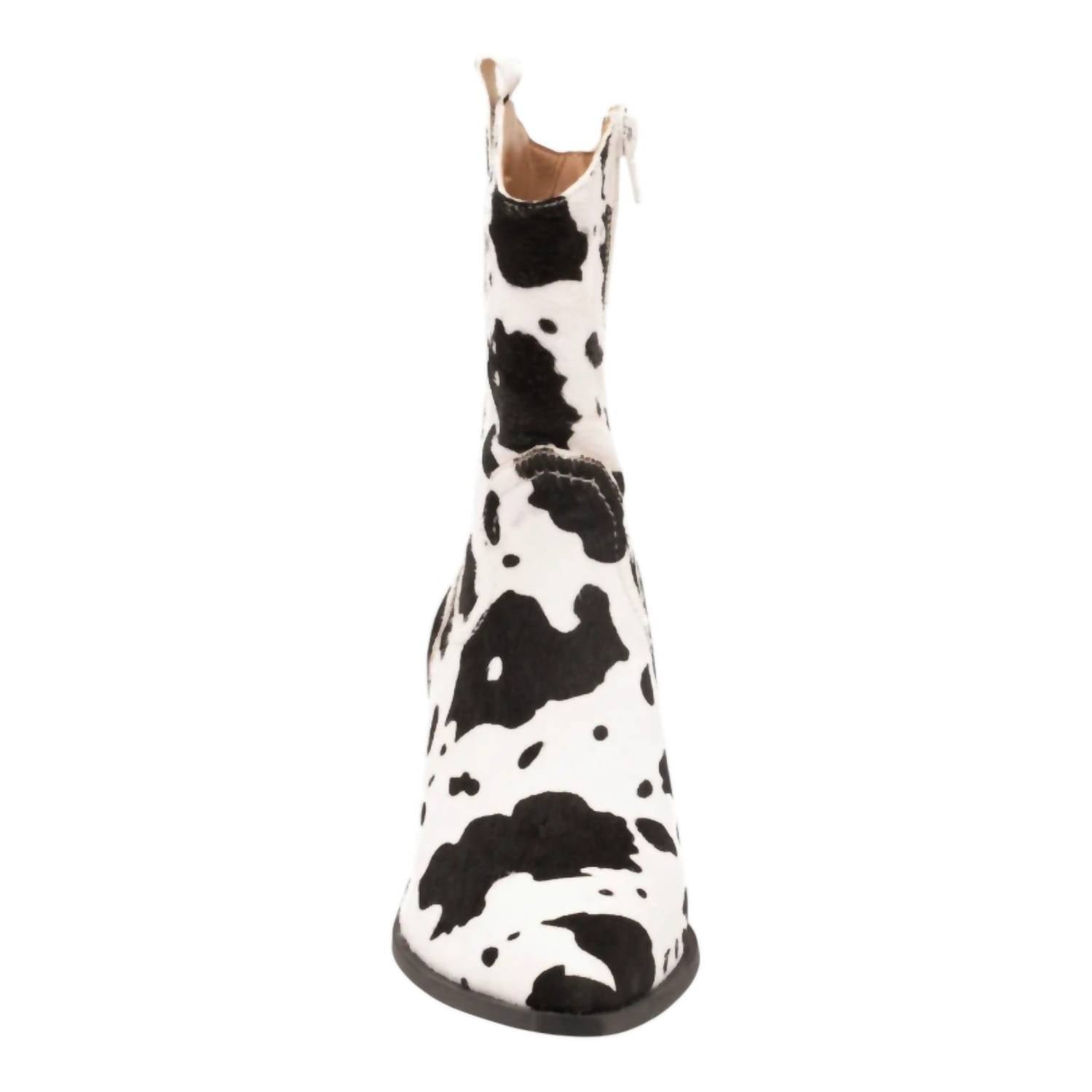 Adventurous choice in ankle boots that dares to stand out. Crafted from leather and embellished with a striking black cow print. Combines bold style with faux hide detailing. Designed with a pointed toe. Boasts a chic 3' block heel to elevate your western-inspired look.