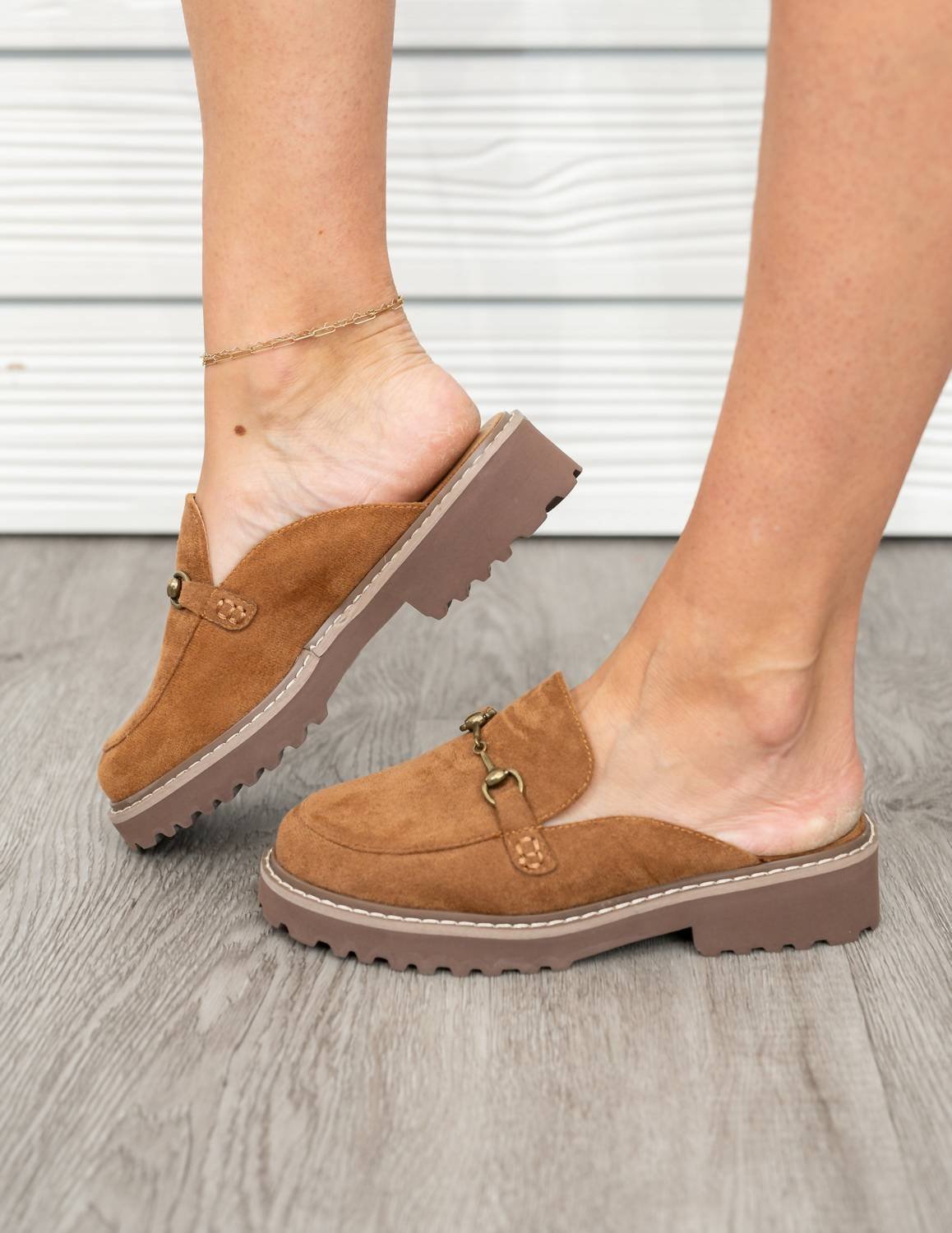 A classic loafer that is both comfortable and polished.Step into style with Corkys Footwear's Wingin It Mule Loafer, crafted from Tobacco Faux Suede. Elevate your look with these vegan leather mules featuring a comfortable round toe and trendy block heel, perfect for Spring and your next travel adventure. This low heel, sized exclusively in whole sizes, recommends sizing up if you typically wear a half size. Designed with a nod to Y2k trends, it's an ideal choice for casual Halloween outings.