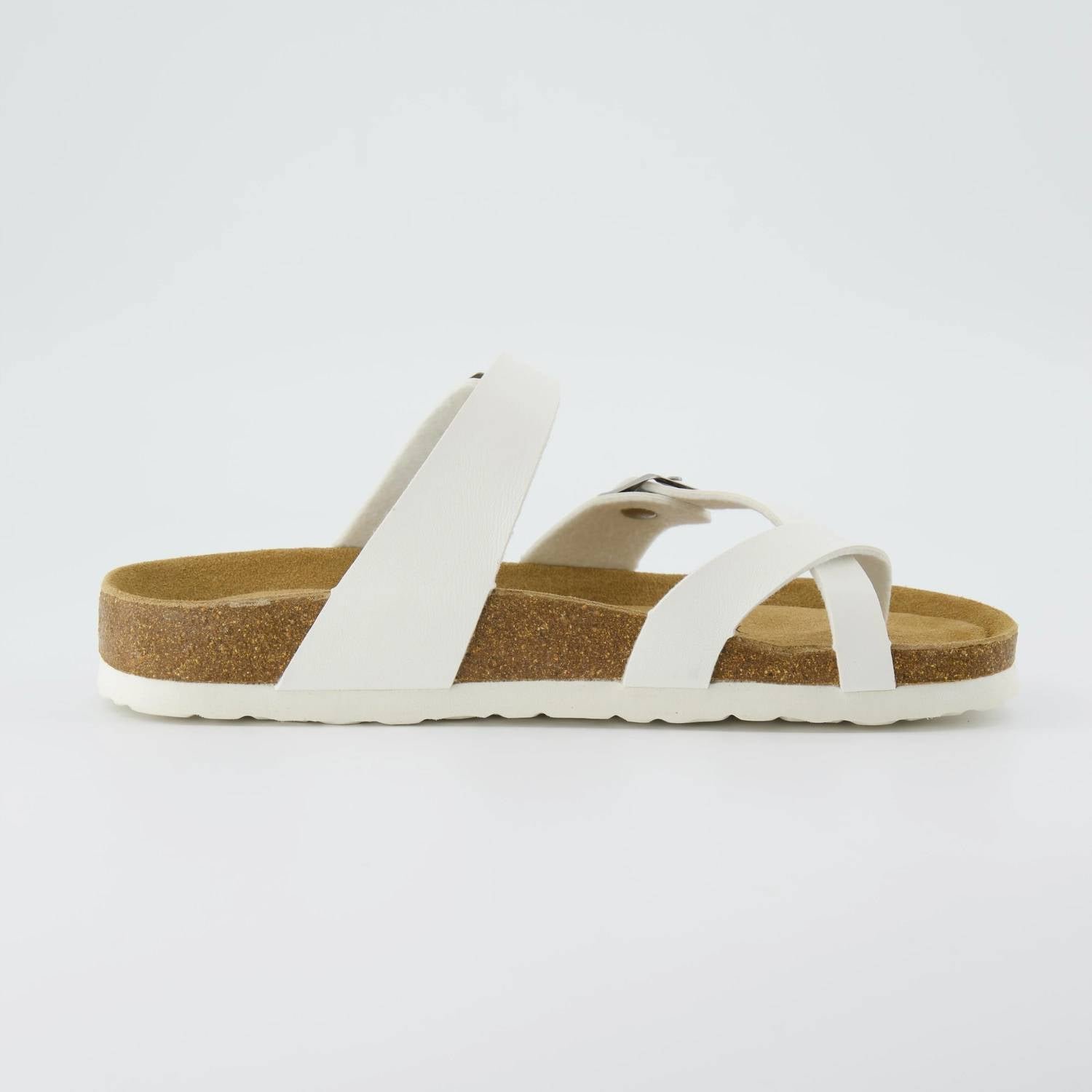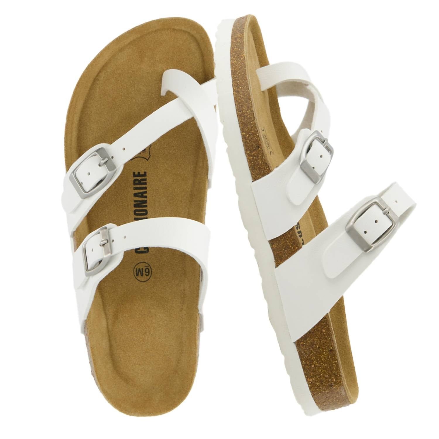 Classicly cute and all-day-wearable. We love this sandal.Step into comfort with the Women's Luna Cork Footbed Sandals by Cushionaire, featuring a 1.25-inch platform and a timeless flat heel design. Crafted with an open toe and wide fit, these white sandals boast a fully cushioned genuine leather insole that conforms to your foot for all-day ease. Adjustable straps ensure a perfect fit, while the extremely soft vegan upper and flexible cork footbed provide superior comfort. Completed with a durable premium traction EVA outsole, these sandals are built to last.