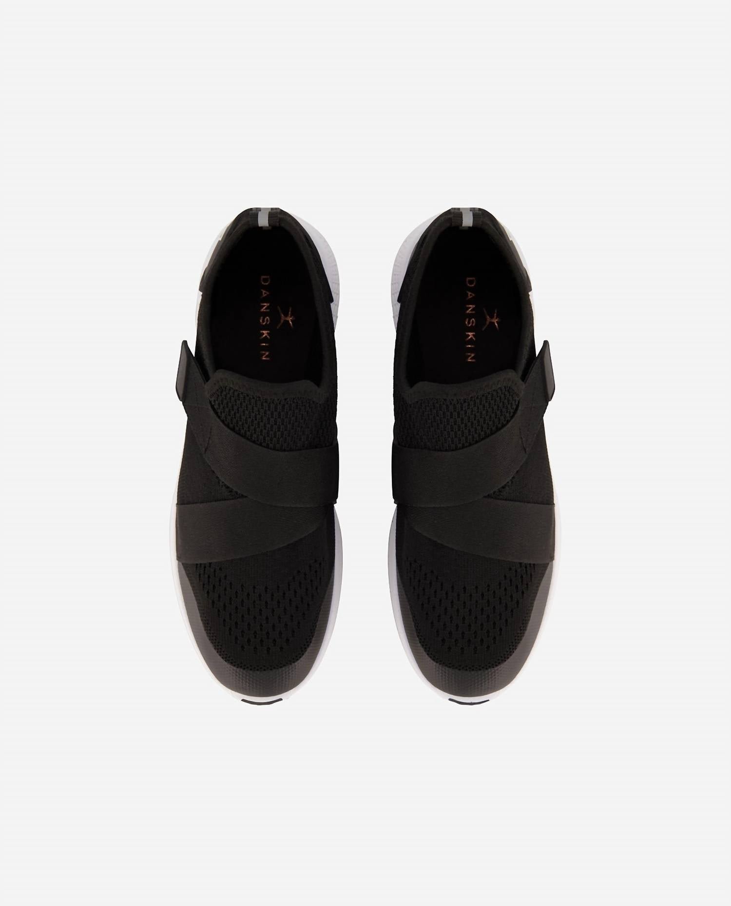 When fashion and function come together seamlessly.Introducing the Danskin Women's Encourage Strap Sneaker in classic black, crafted with a minimalist design perfect for travel and casual wear. Featuring a round toe and a low heel height between 1 1/4' to 2', these sneakers ensure comfort with every step. Made from 100% polyester, they include a convenient strap closure and a rubber sole for effortless movement. Designed with a loop at the heel for easy on-and-off, these sneakers fit true to size and are easy to maintain with a simple wipe clean.