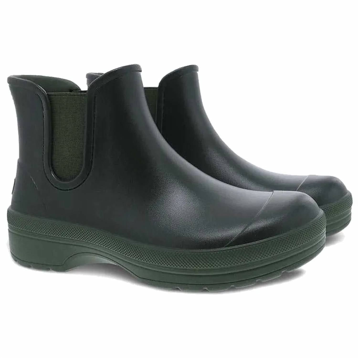 Rainy day No problem! The cutest and most comfortable rainboots of the season.The uppers and the removable footbed are made from over 50% I'm Green Biobased injected EVA, making it lightweight and durable, and easy to clean. The footbed is cushioned and features Dansko Natural Arch technology for added arch support, and the channeled outsole provides durability and long-lasting wear. This is a rain boot that feels great and is made from materials you can feel good about. Easy clean uppers Waterproof construction and lightweight Bio-based EVA (over 50%) which is lightweight and durable Removable, energy return EVA footbed with Dansko Natural Arch technology for added support Textile footbed cover treated with Aegis Microbe Shield odor control Strategically placed lightweight rubber outsole pads for durability