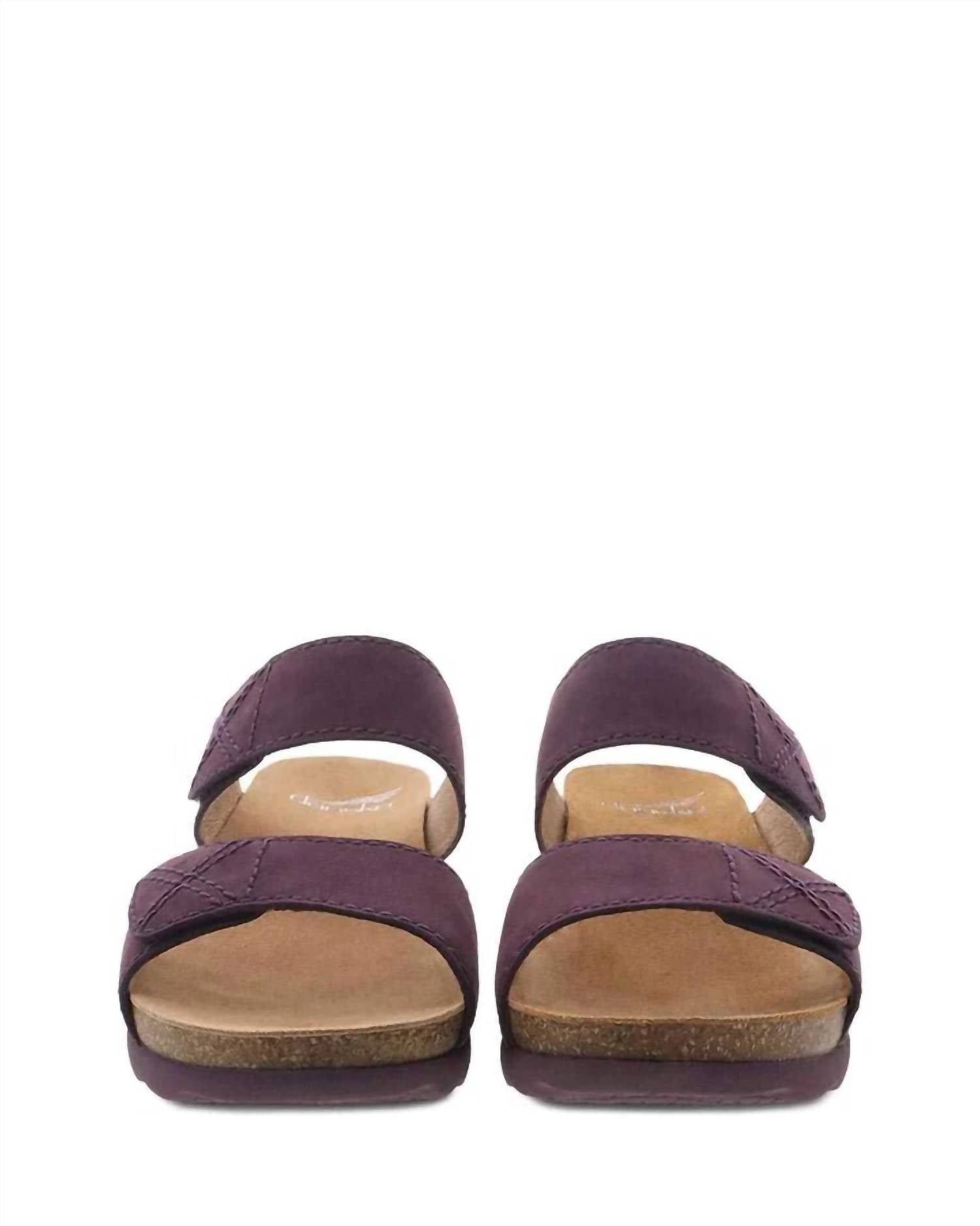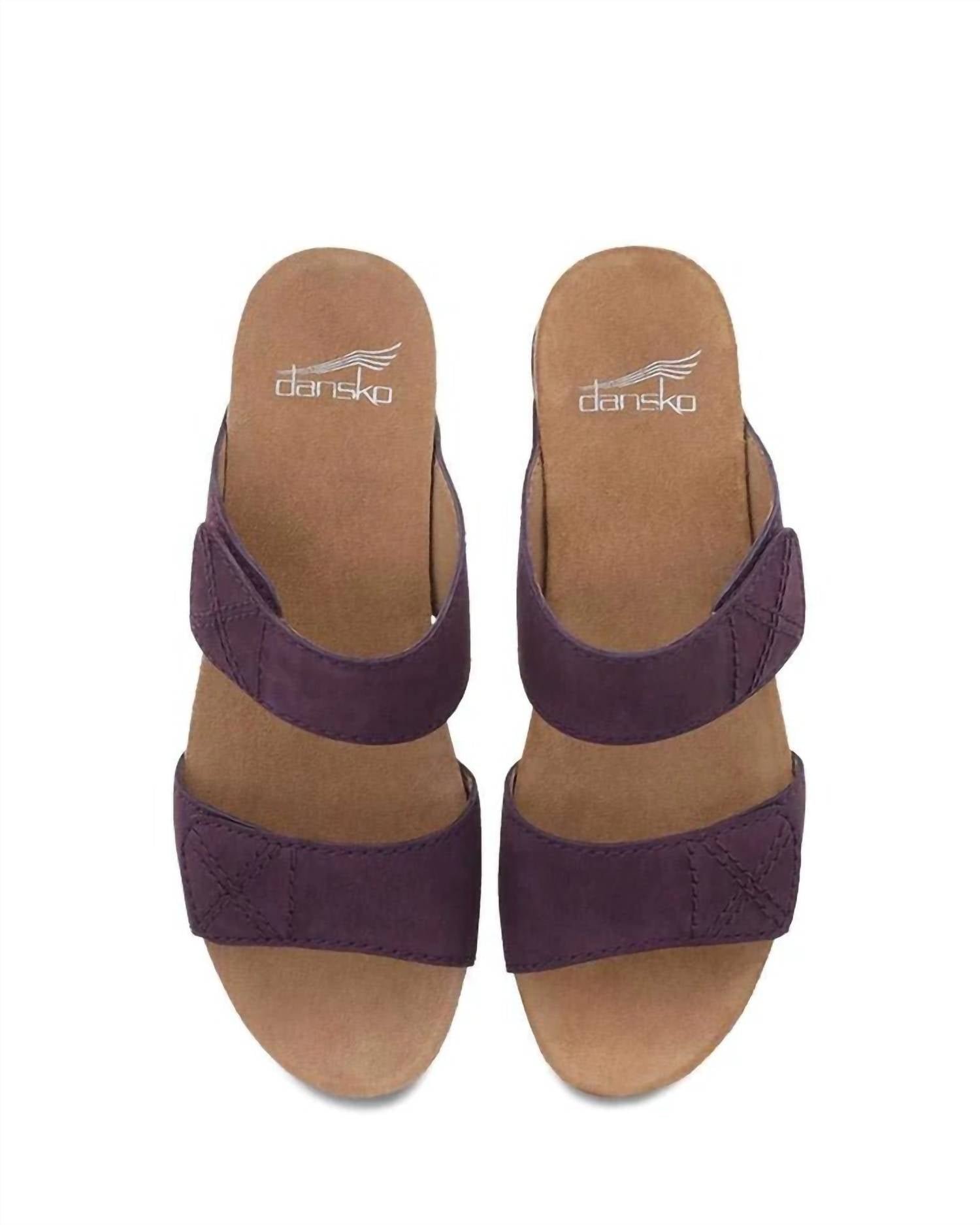 This sandal will take you from brunch to dinner and everything in between.Elevate your spring wardrobe with the Women's Maddy Sandal by Dansko, a chic choice for any dinner party. Crafted with leather uppers in a Purple Milled Nubuck, this sandal features nubuck treated with 3M Scotchgard protector, ensuring stain resistance. The open-toe design boasts an open-back with double straps, equipped with hook and loop closures for full adjustability and a comfortable wedge heel. The lightweight cork EVA midsole and rubber outsole provide durability, while the microfiber lining with Aegis Microbe Shield offers odor control.