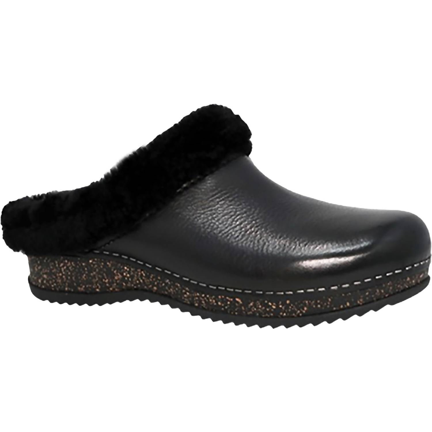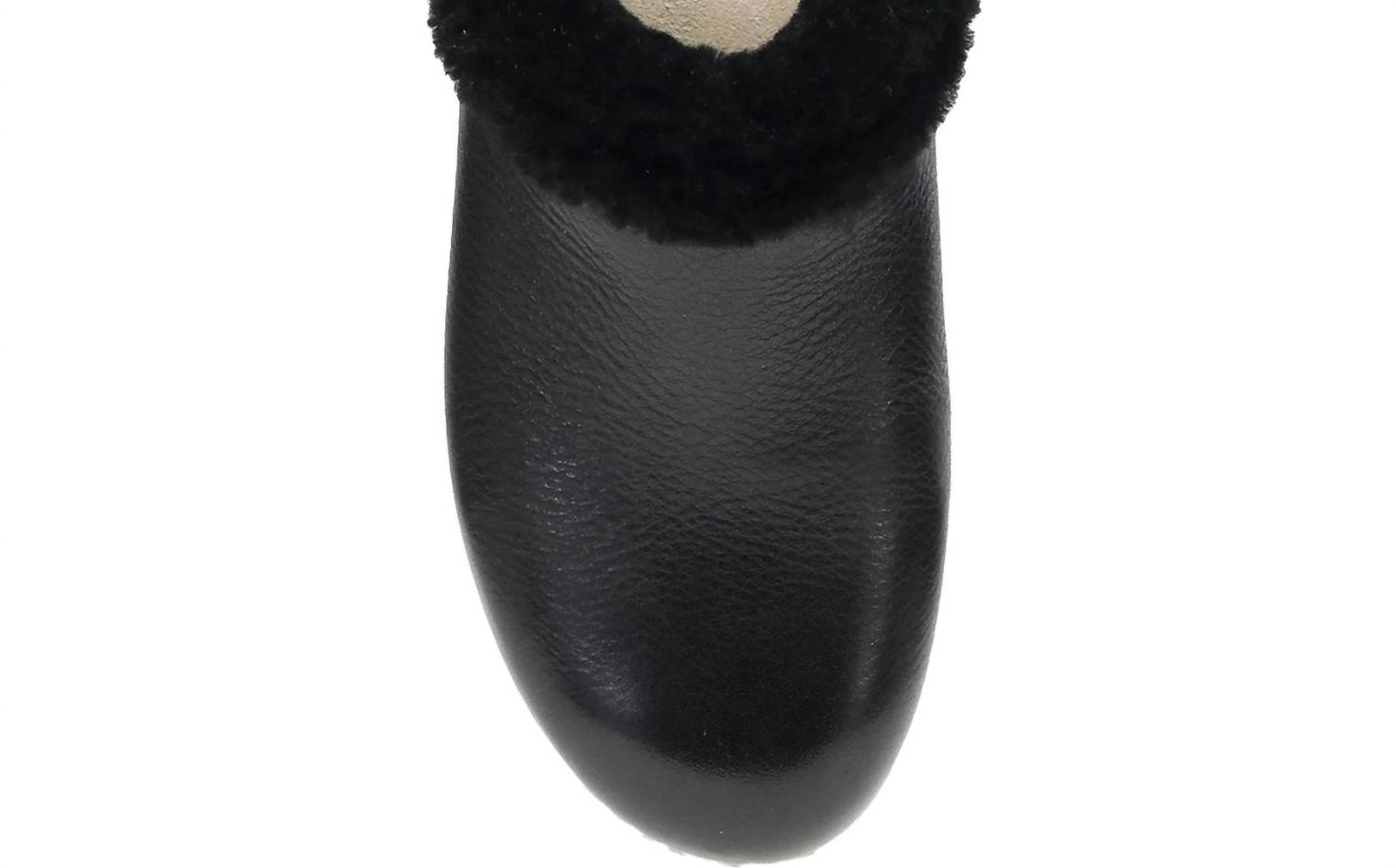 Slip them on and go! Stay cozy and stylish with the Dansko Women's Magda Waxy Milled Mule, perfect for chilly winter months. Crafted from premium black waxy milled leather, these mules boast a shearling cuff and luxurious soft linings, offering exceptional comfort and chrome-free breathability. Featuring a cushioned EVA footbed and a lightweight rubber outsole, they provide all-day support and long-lasting wear. With a heel height of 1.25 inches, these slip-on mules are ideal for easy comfort at dinner parties or any festive occasion.