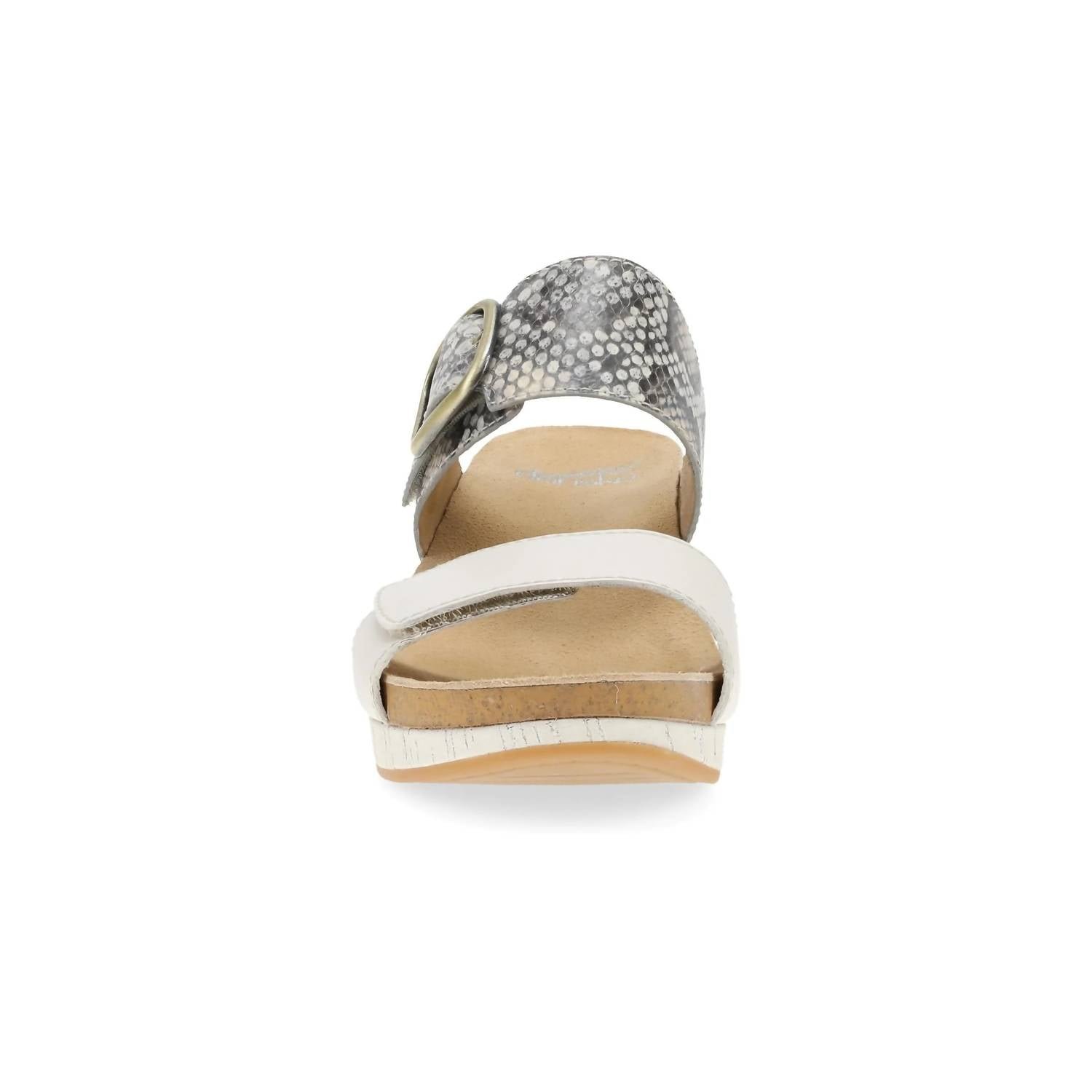 Flowy dresses, cropped pants, and even jumpsuits... this sandal works with them all!Step into effortless style and comfort with the Dansko Women's Shannon Sandal in Leather Snake Ivory, perfect for diverse occasions. This open-toe sandal showcases high-quality nubuck leather treated with 3M Scotchgard for stain resistance and features a sleek minimalist design. The cushioned energy-return PU footbed and lightweight BPU midsole with an EVA/cork wedge ensure long-lasting wear, complemented by a durable rubber outsole and hook & loop adjustability. Ideal for summer events like brunches and backyard weddings, this sandal is your go-to choice for elevating your look with confidence.