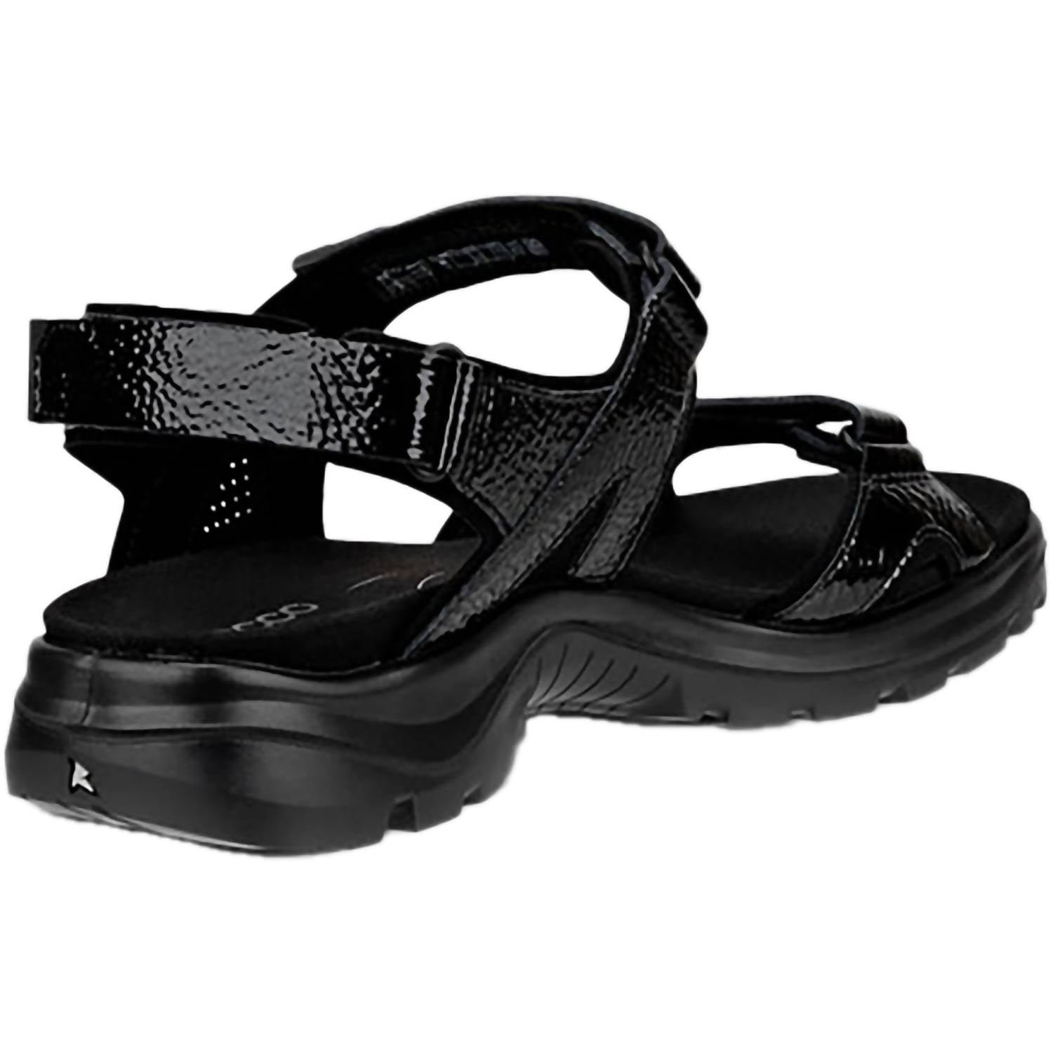 Flowy dresses, cropped pants, and even jumpsuits... this sandal works with them all!Experience the perfect blend of functionality and modern style with the ECCO Women's Yucatan 2.0 3S Crinkle Patent Offroad Sandal in Black. Crafted from ECCO nubuck leather using eco-friendly DriTan Technology, this sandal features lightweight molded EVA footbed with a soft microfiber cover, and RECEPTOR technology for stability. Designed for optimal comfort, the sandal includes three fully adjustable quick-fastening straps, ensuring a customizable fit. Built with a rugged rubber outsole, it offers durability and grip across all terrains, making it ideal for summer hikes and casual outings. Shoe Width: Medium. Heel Height: Flat (1' & Under). Toe Shape: Open Toe.