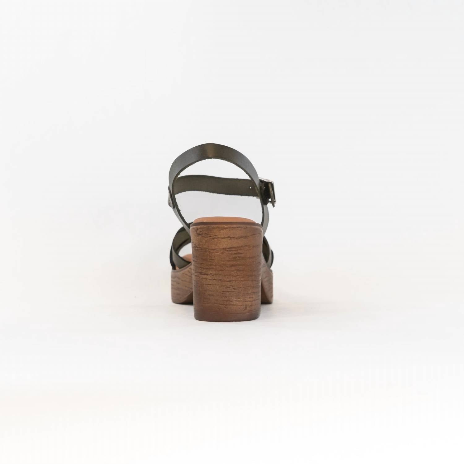 Classicly cute and all-day-wearable. We love this sandal.Block heel sandal. Olive green straps. Buckle closure. Crisscross design. Wood-textured sole.