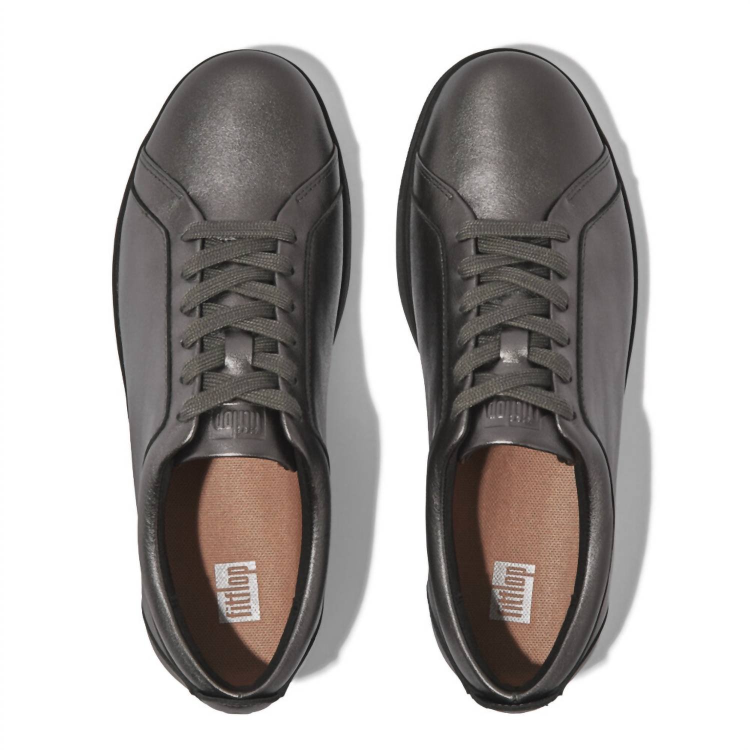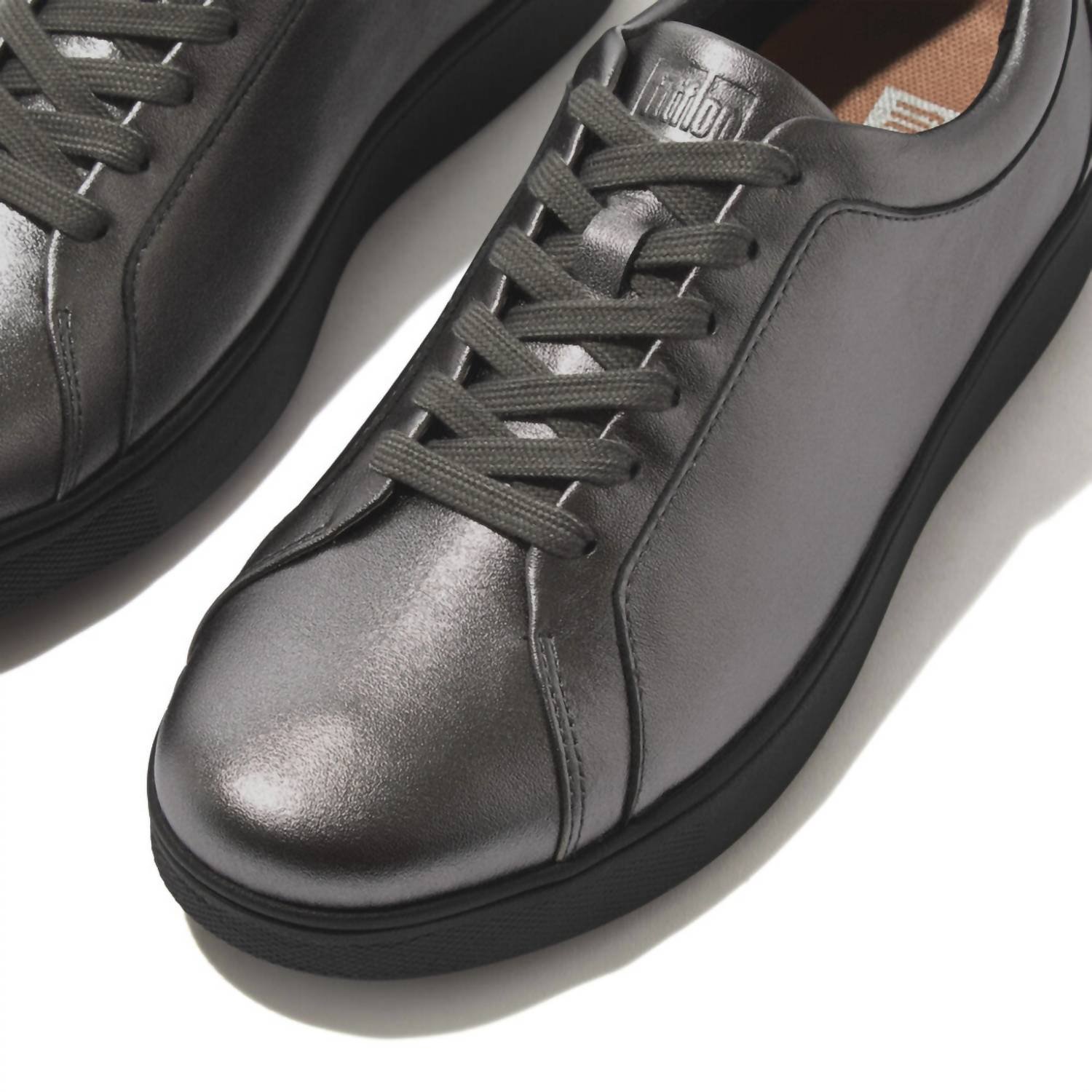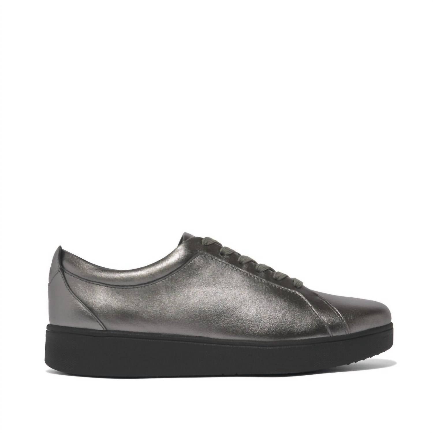 Cute, functional, and comfortable. These sneakers check all the boxes.Step into style with the Women's Rally Lace-up Leather Sneaker by FitFlop, boasting a classic round toe in a chic pewter shade. Crafted with a supple leather upper and a Lycra/Anti-Bacterial Mesh lining, these sneakers offer both elegance and practicality. They feature slip-resistant rubber outsoles and are secured with laces, providing stability and a snug fit. Innovatively designed with Anatomicush technology, they promise ultra-lightweight flexibility and comfort for busy days.
