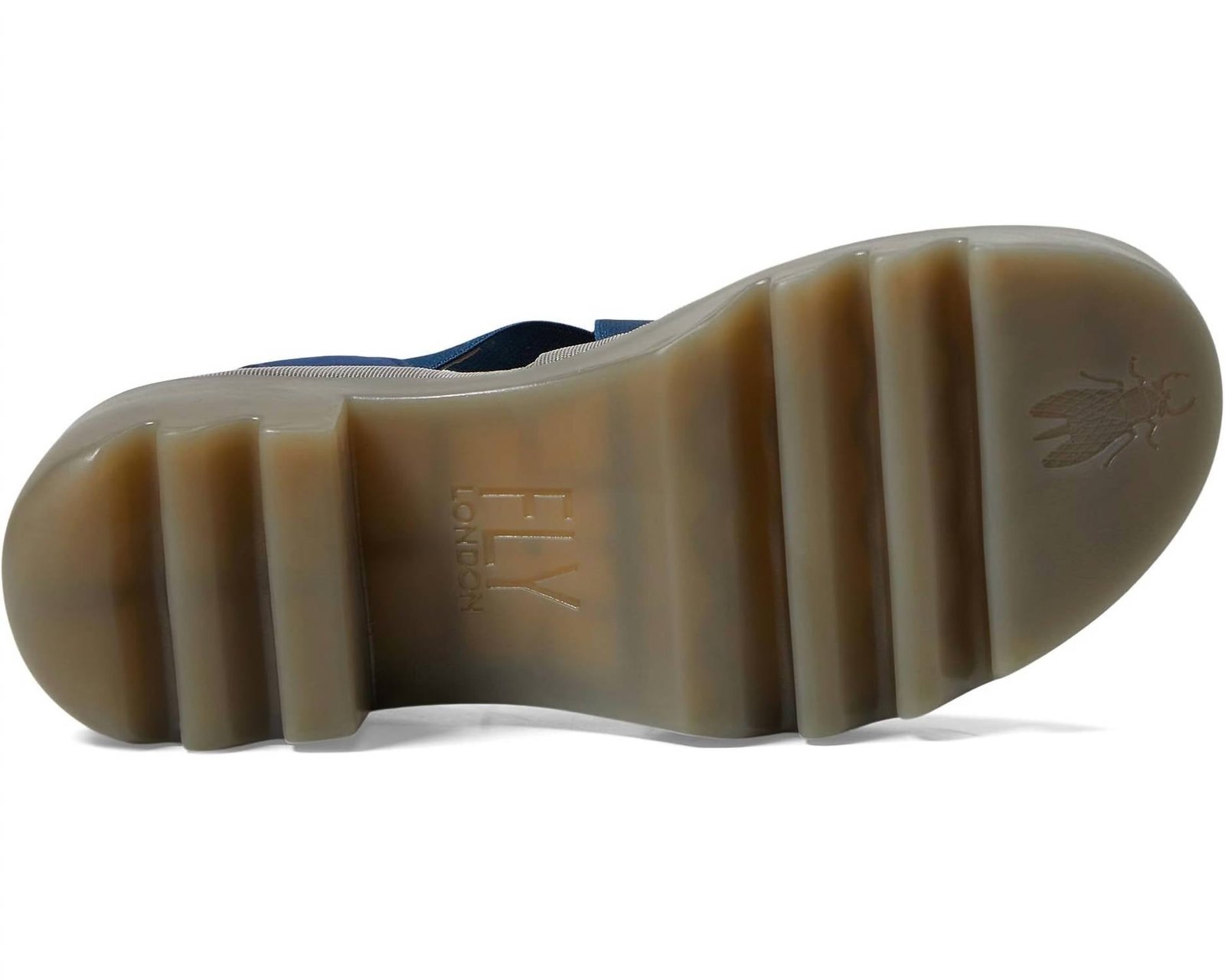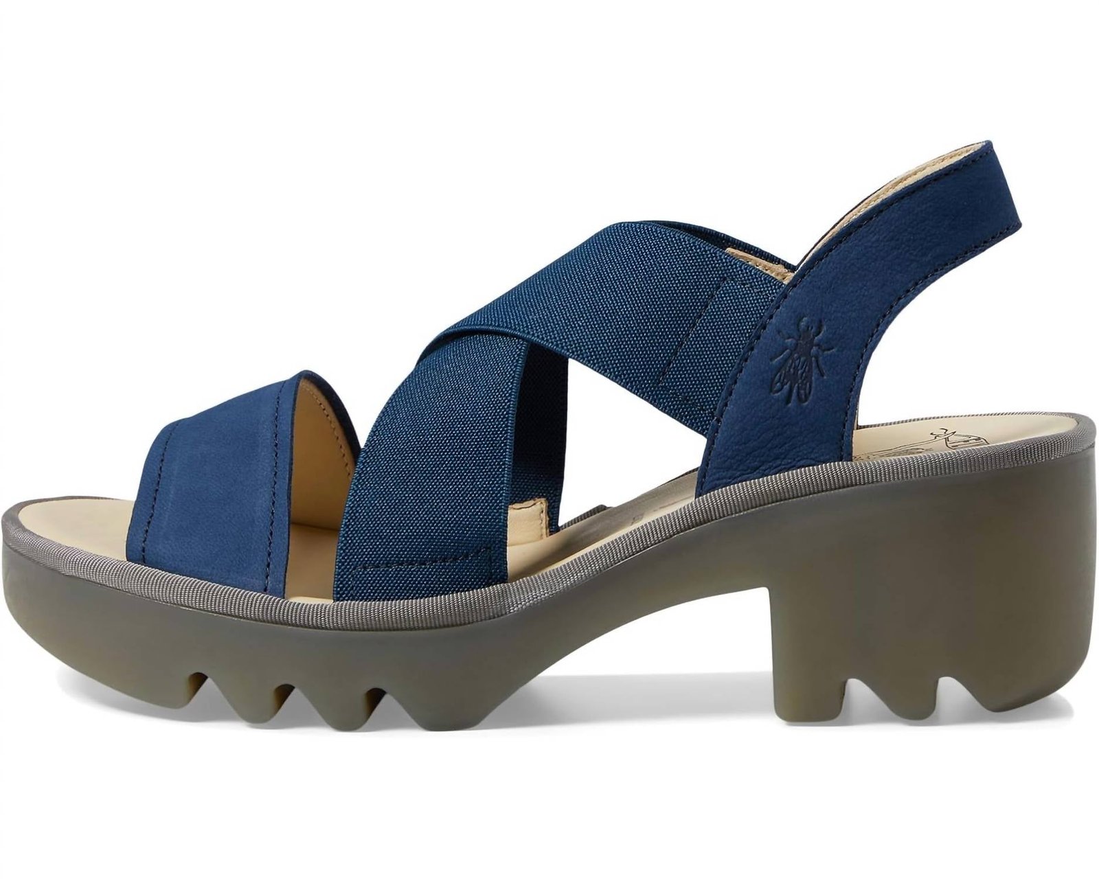 This sandal will take you from brunch to dinner and everything in between.Step into style with the FLY LONDON TAJI502FLY Heeled Sandals, a perfect blend of minimalist fashion and all-day comfort. Designed with a blue leather and textile upper, these slip-on sandals feature elasticized front straps for a custom fit. Made in Portugal, they boast a padded leather footbed and a lugged synthetic outsole, with a round open toe, mid-height 2.5-inch block heel, and a 1-inch platform. These sandals are versatile and can easily be paired with a variety of outfits, offering comfort and support throughout the day.