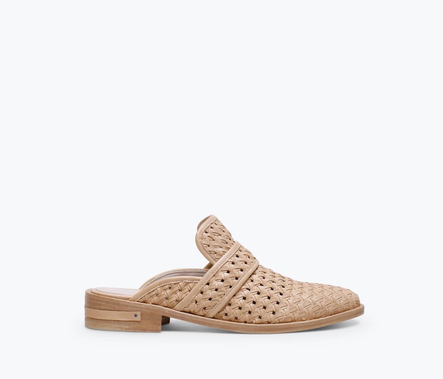 A trend that everyone is loving and this style might just be our favorite.Slip into unparalleled style with the Keen Mule by FREDA SALVADOR, a chic choice in nude woven leather for any occasion. Crafted from 100% Spanish leather, these mules boast a studded welt and a comfortable almond toe design. With a 1' stacked leather heel and a durable leather sole featuring a rubber layer, these shoes are both stylish and practical. Opt for a minimalist spring look with this slip-on mule, perfect for holiday parties and beyond.
