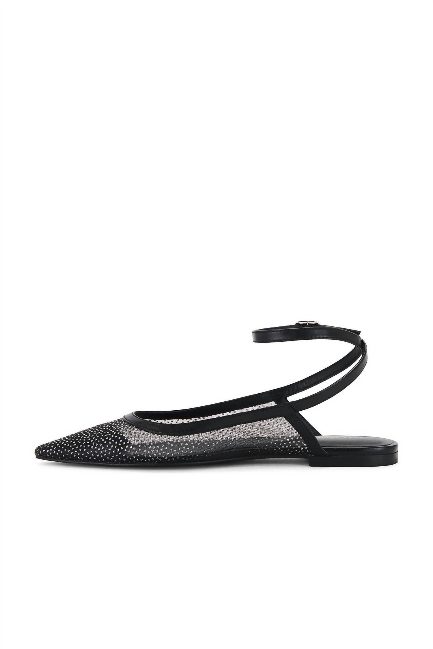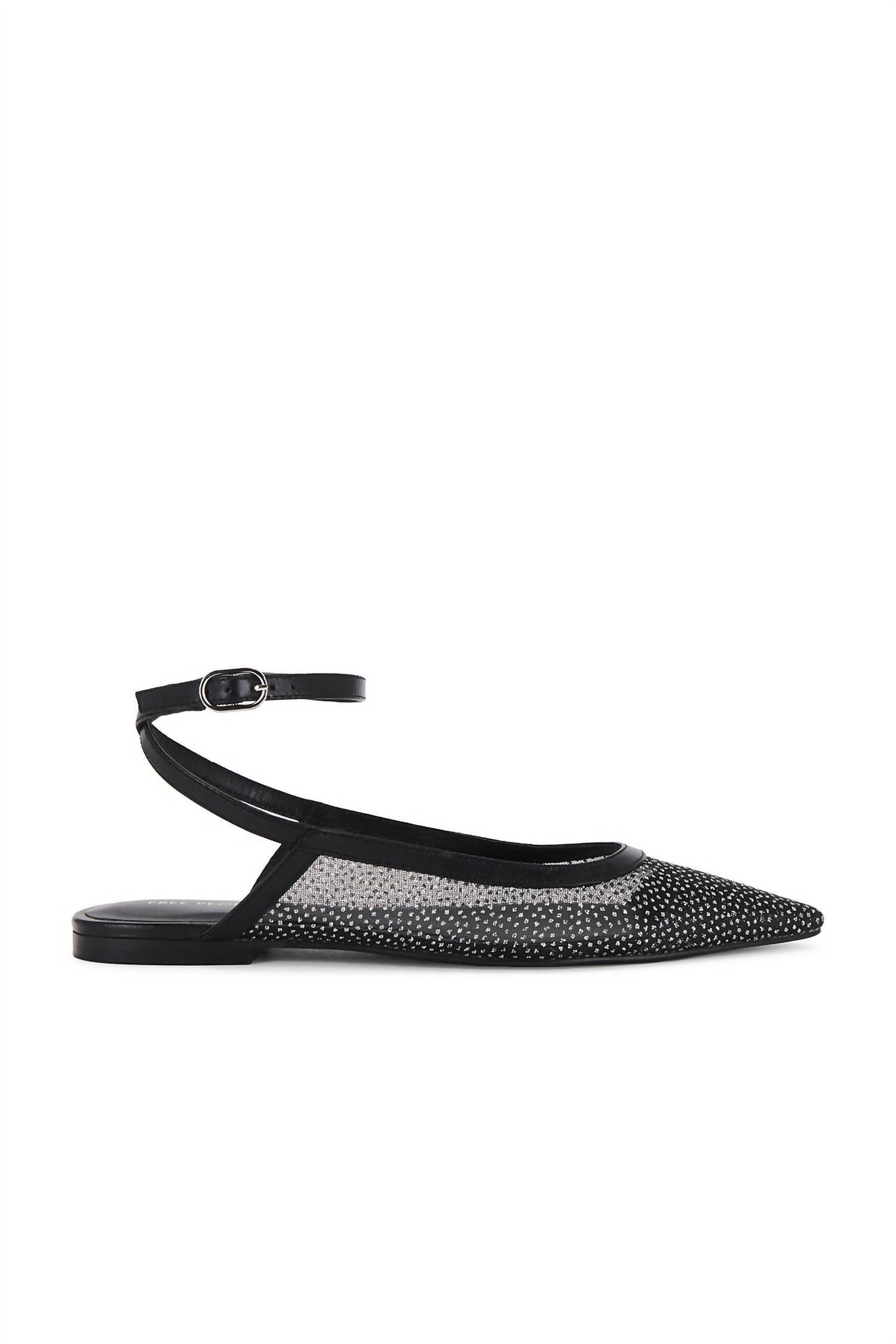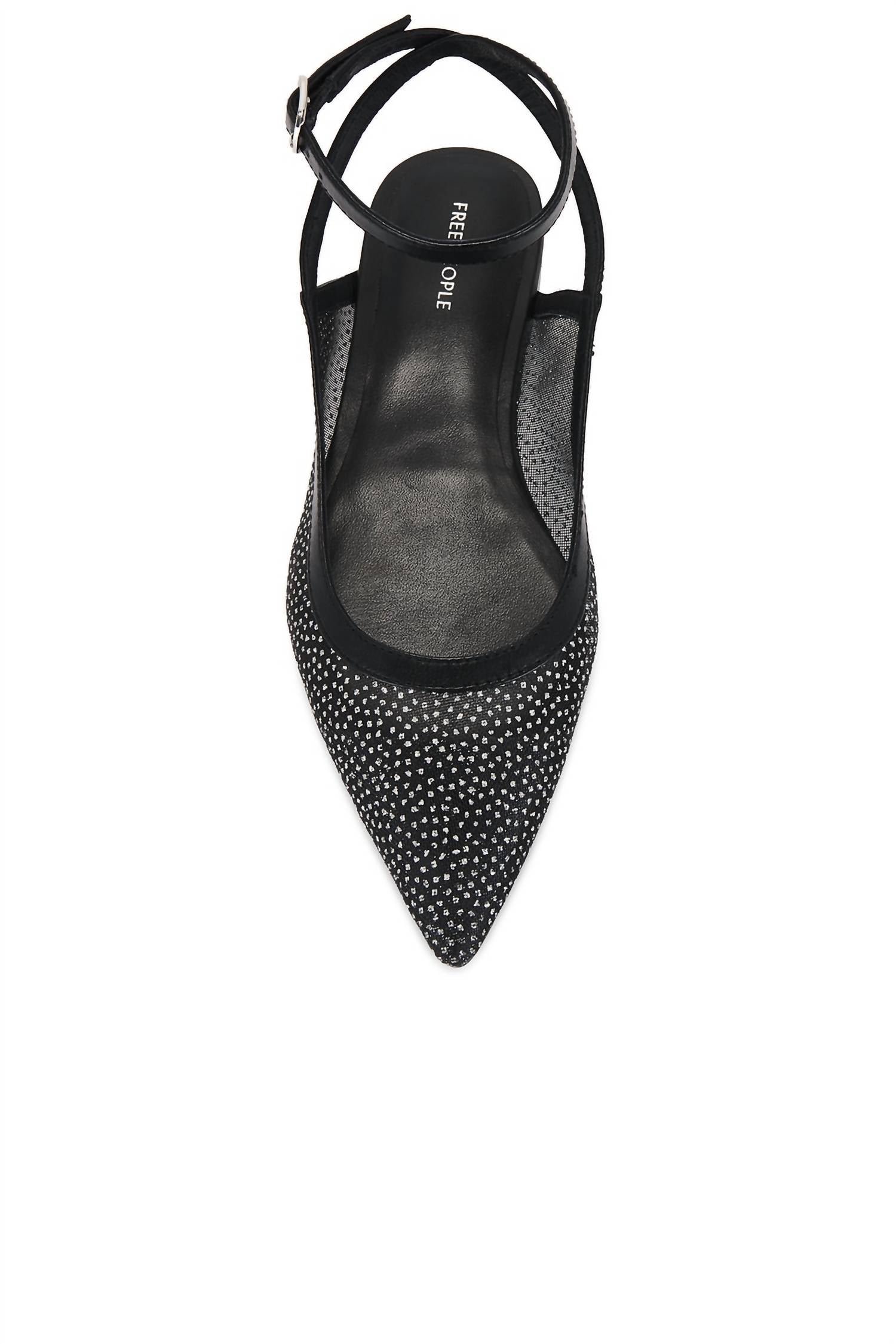 A preppy yet feminine take on the classic loafer.Introducing the Women's Sheer Glitter Jules Flats by Free People, designed to elevate your style with a chic and sophisticated flair. These ballet flats feature a striking glittering sheer mesh composition, complemented by a solid pointed toe and a slip-on style for easy wear. The flats are thoughtfully crafted in India with premium textile, leather, and rubber materials, embodying the renowned FP Collection's vintage aesthetic. Closure: Adjustable buckle ankle strap.