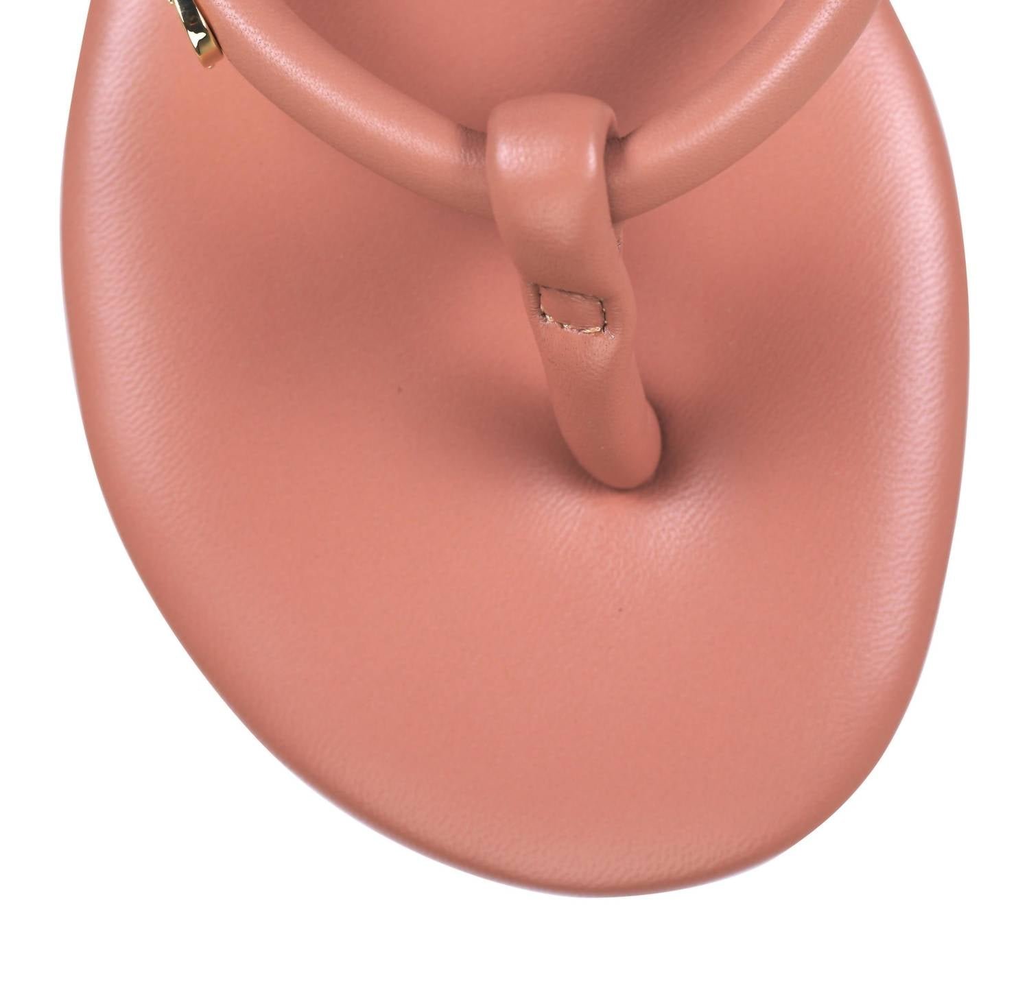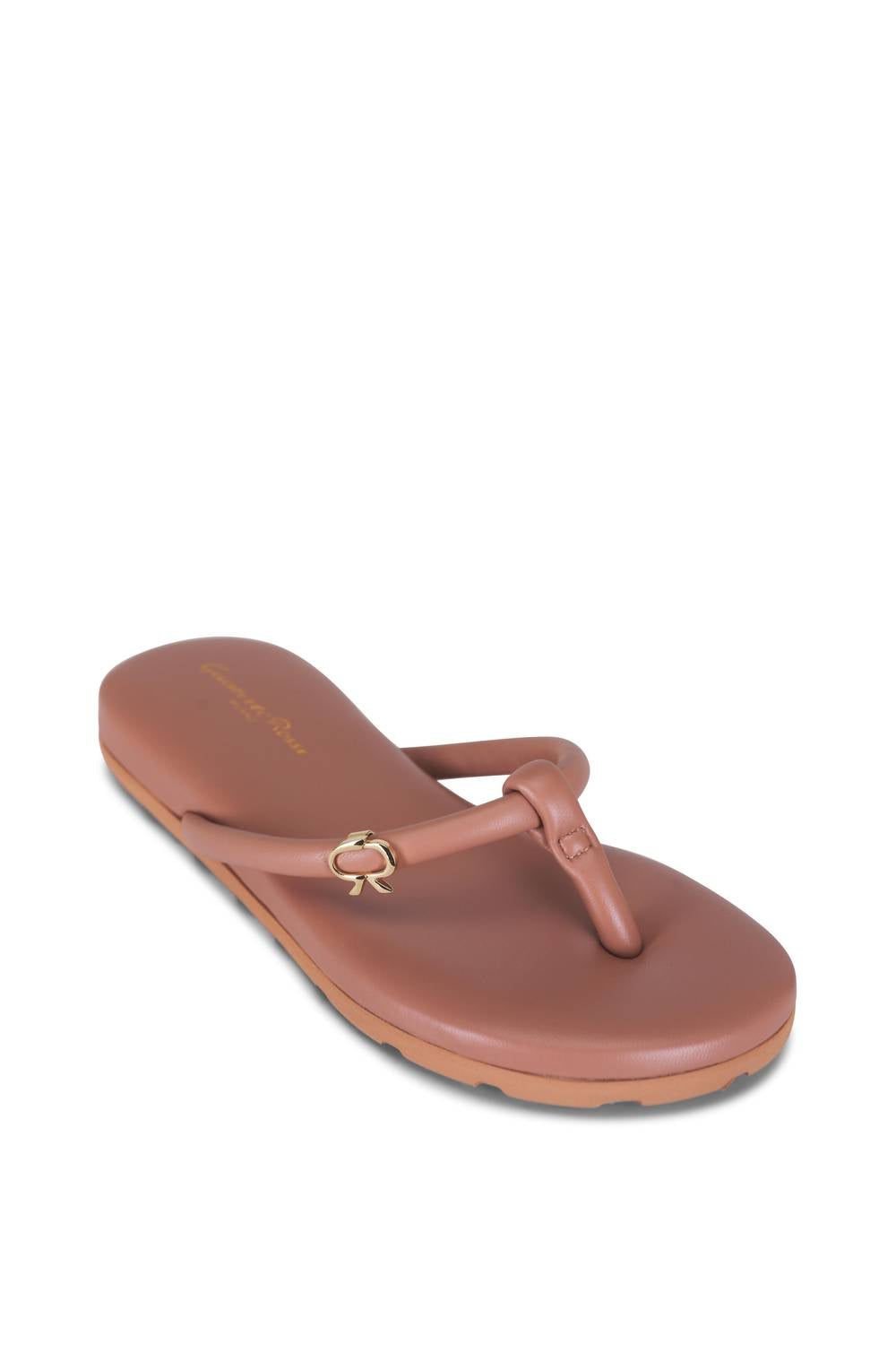 Classicly cute and all-day-wearable. We love this sandal.Step into effortless style with the Women's Fiji Thong Sandal by Gianvito Rossi, a must-have for your vacation wardrobe. The sandals are crafted from 100% nappa leather and feature a flat heel design, perfect for embracing streetwear trends in a praline color. Highlights include a round open toe with padded thong style and a strap at the vamp adorned with gold tone logo hardware. The sandals also boast a treaded rubber sole and a logo stamp at the padded footbed, ensuring both comfort and chic allure.