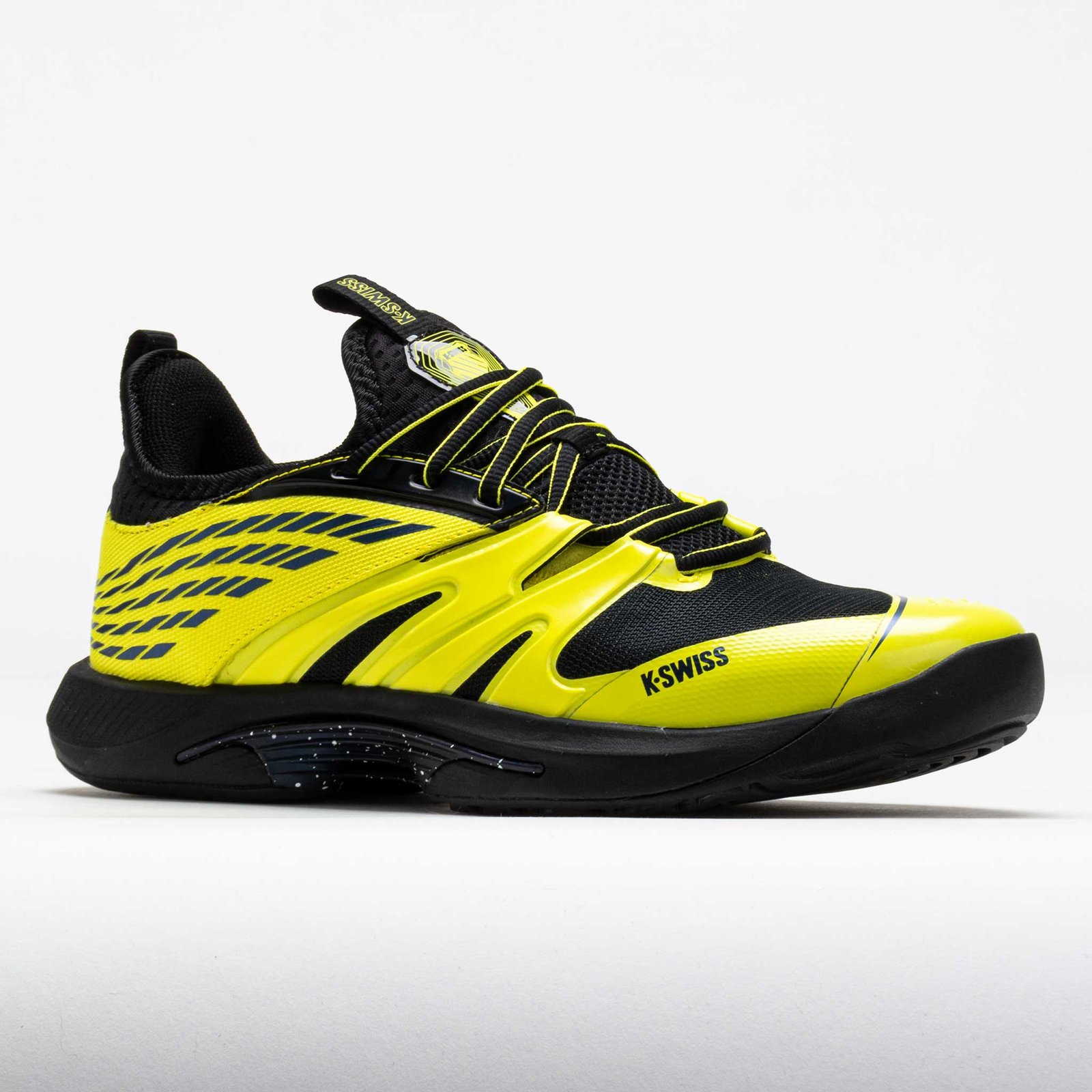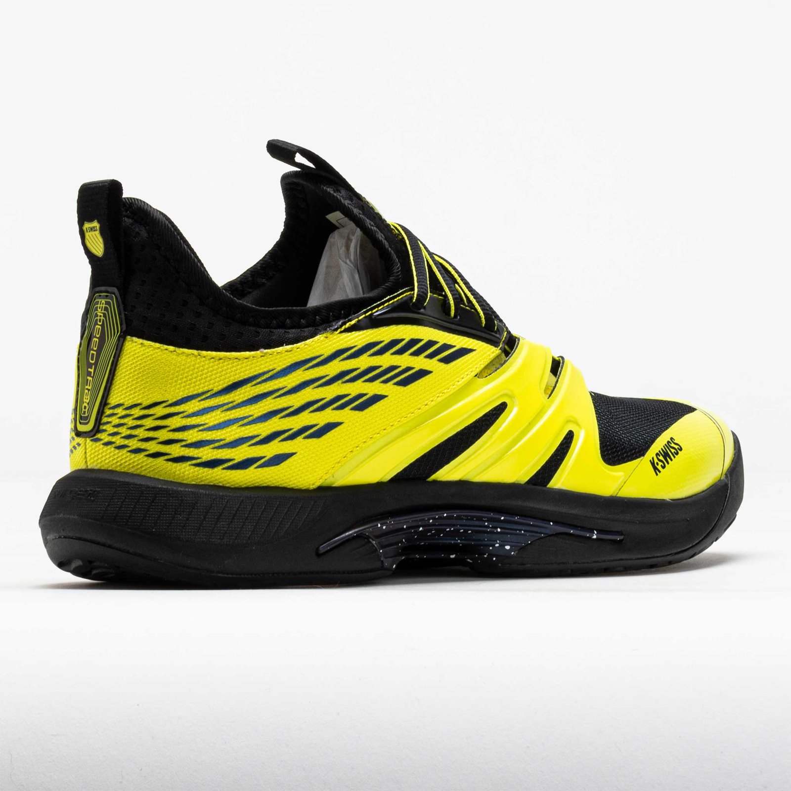 Theres no speed limit on the tennis court. Meet the K-Swiss Speedtrac. a lightweight tennis shoe that provides reliable traction and rapid acceleration. Stay secure during quick cuts and lateral movements in the bootie constructed upper. The Surge 7.0 midsole provides explosiveness with every step. while the DragGuard 7.0 outsole protects high-wear areas. Worn by many top pros. the K-Swiss Speedtrac is perfect for players who like to go fast!