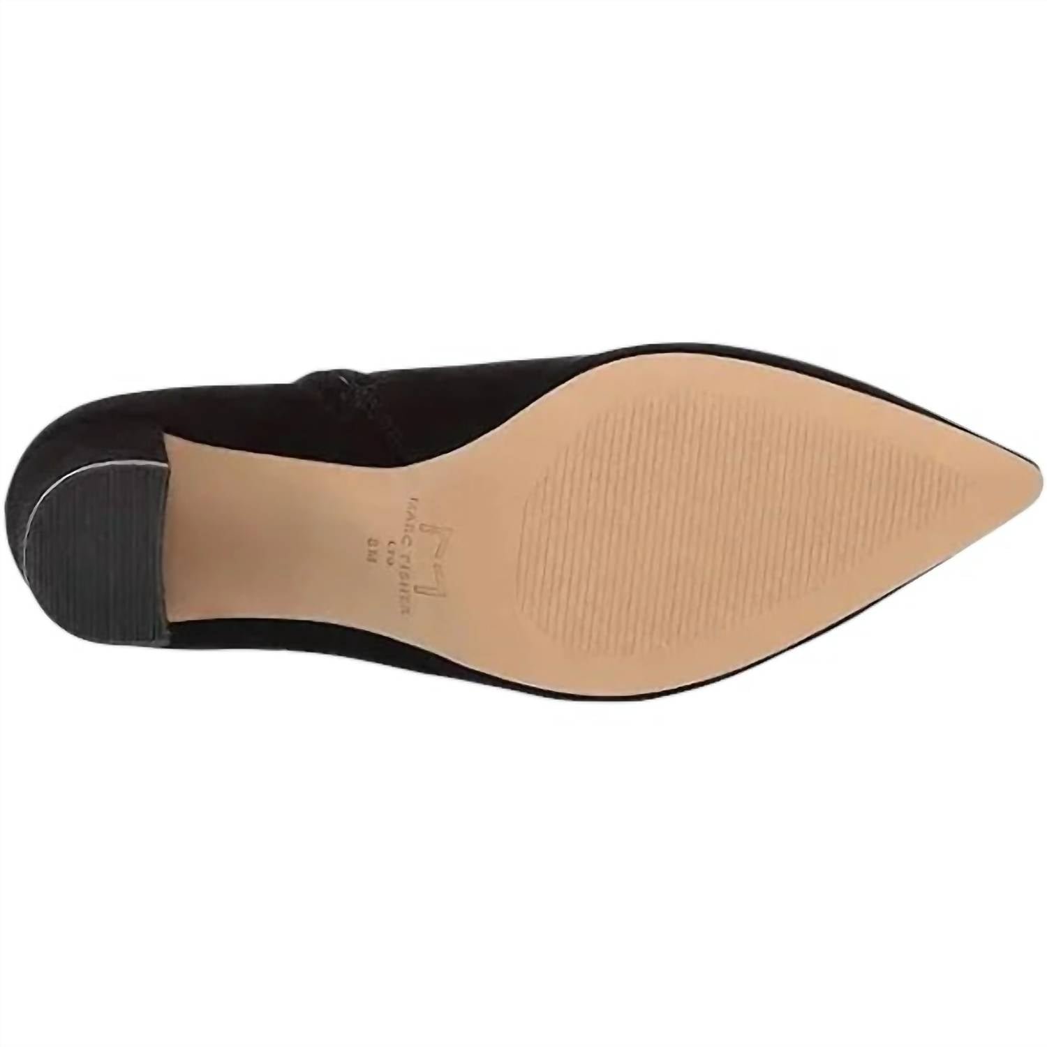 Say hello to the perfect, most versatile boot. The ankle height makes this style easily transition from day to night. Wear them with your favorite skinny jeans and tee for a more laid back look, or pair them with your favorite mini dress and jacket for a night out on the town.Step into elegance with the Women's Ulani Suede Ankle Boots by MARC FISHER, designed in classic black for a minimalist fall style. These boots feature an elongated upper with a pointed toe and a functional inner zipper closure, ensuring both style and ease of wear. Crafted from premium suede, they boast a cushioned footbed for comfort and a stylish block heel measuring 3.25 inches in height, complemented by a 5-inch shaft. Ideal for evening events or a chic New Year's Eve look, these boots are a sophisticated addition to any wardrobe.