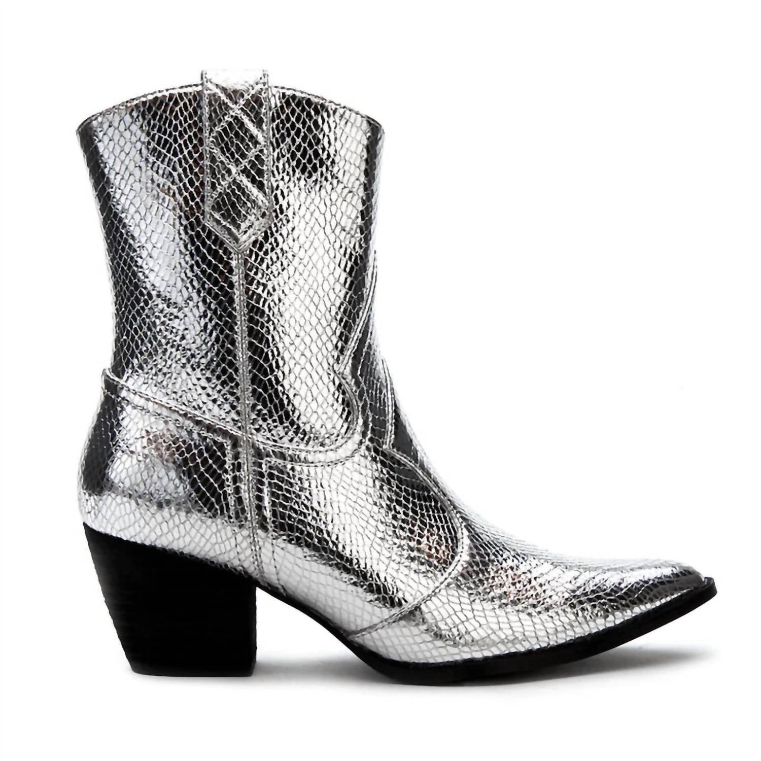 Say hello to the perfect, most versatile boot. The ankle height makes this style easily transition from day to night. Wear them with your favorite skinny jeans and tee for a more laid back look, or pair them with your favorite mini dress and jacket for a night out on the town.Introducing the Women's Bambi Western Boots by Matisse, a chic fusion of modern style with a Western flair in Silver Snake. These boots feature a synthetic leather upper and a manmade outsole, with a sturdy 2.5-inch block heel for a comfortable lift. With a shaft height of 7.75 inches and a topline circumference of 11.5 inches, they offer a sleek fit. Closure: Zipper closure. Made with a textile lining and padded insole, these boots are imported and perfect for adding an exotic edge to your look.