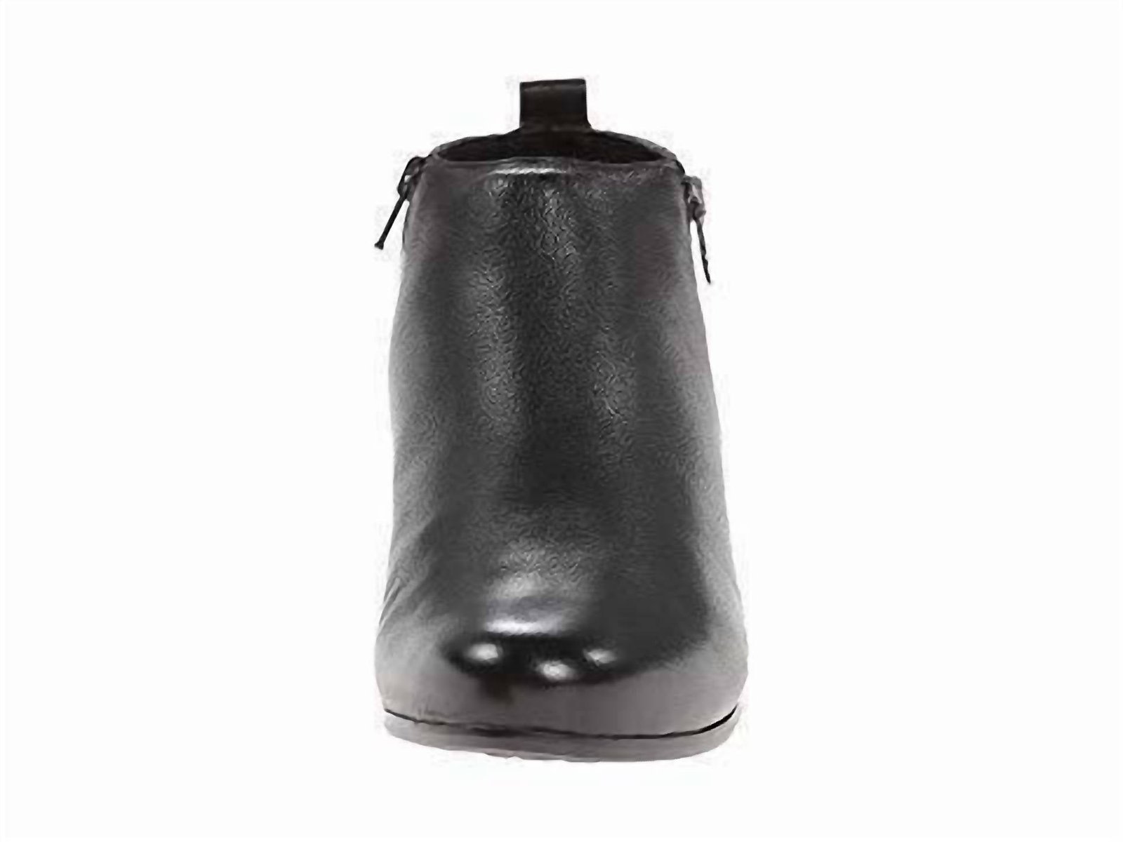 Say hello to the perfect, most versatile boot. The ankle height makes this style easily transition from day to night. Wear them with your favorite skinny jeans and tee for a more laid back look, or pair them with your favorite mini dress and jacket for a night out on the town.Embrace style and comfort with the Women's Lexi Kid/Print Leather Bootie by Munro. Crafted with a rich leather upper and a stylish printed detail on the heel cup, these booties feature dual side zippers and a heel tab for easy on and off wear. The cushioned, leather-lined footbed provides superior support, while the natural rubber outsole absorbs shock to minimize fatigue. Designed with a stylish stacked heel and steel shank construction, these black monochrome booties are perfect for fall travel and everyday stride.