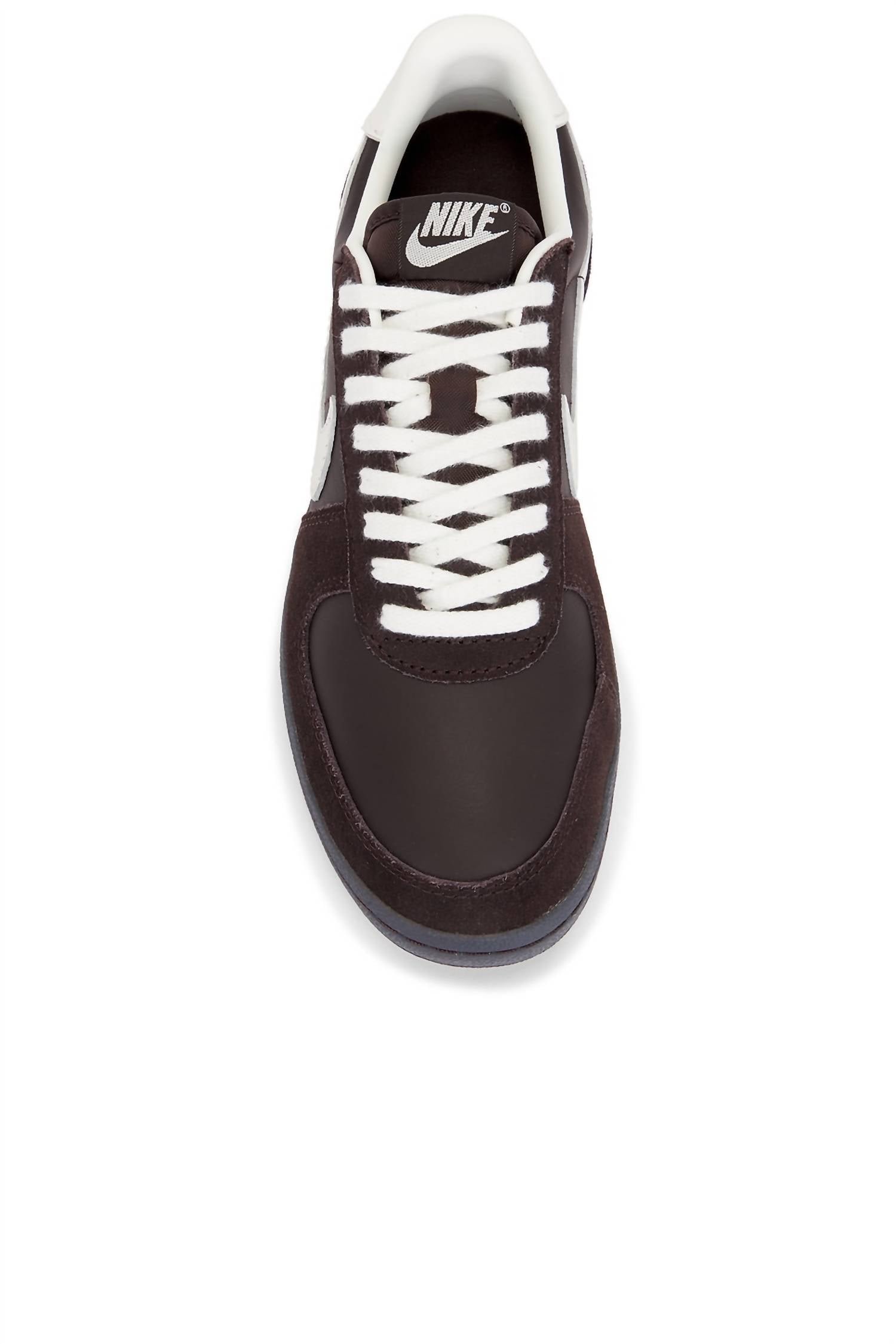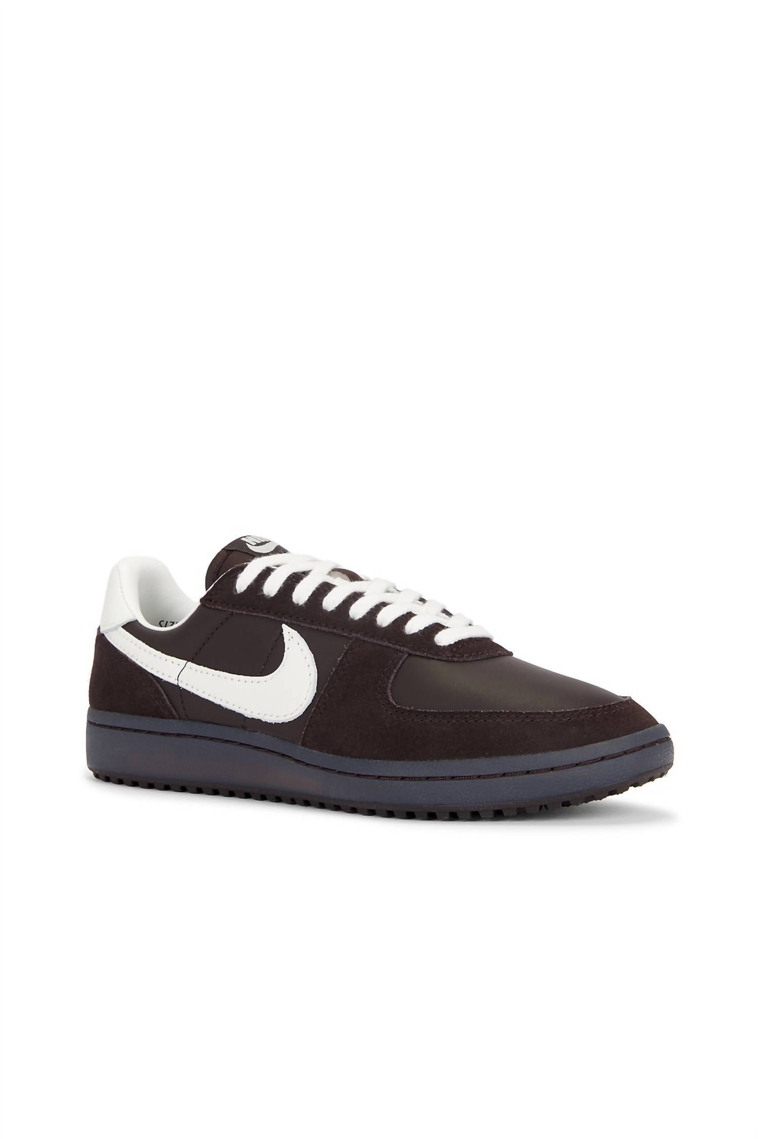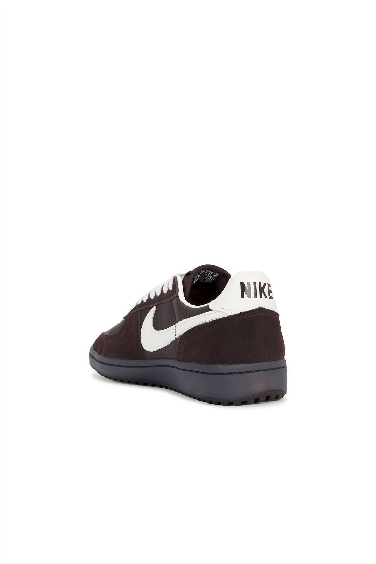 Introducing the Women's Field General Sneaker by NIKE, a bold reimagining of a classic with velvet brown and sail hues. Crafted from genuine smooth leather and soft suede, this sneaker captures a vintage '80s gridiron aesthetic. Its foam midsole provides comfort, while the nubby Waffle rubber outsole ensures durable traction. Perfect for fashion enthusiasts, this sneaker carries the manufacturer ID HV5130-220.