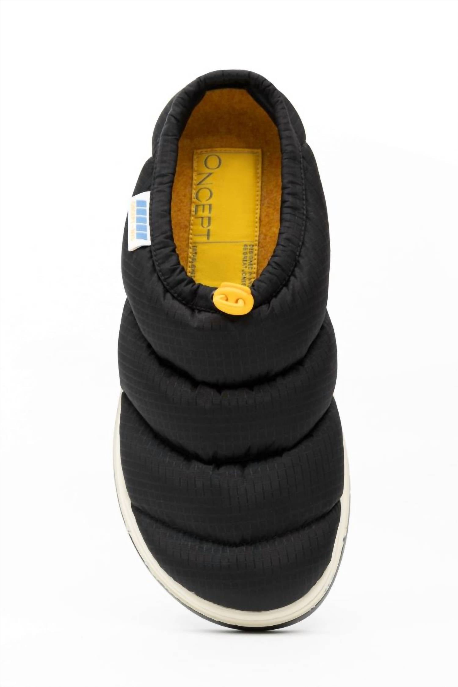 A trend that everyone is loving and this style might just be our favorite.This sleek black mule is made from ultra-soft, water-resistant recycled nylon and supple suede. Designed for comfort and sustainability, it features plush organic cotton filling and easy slip-on construction. With a durable two-ton molded bottom and recycled insole boards, it includes re-plastic toggles and elastic cording for a secure fit. Perfect for everyday wear, it combines functionality with stylish re-splash ripstop and re-speckled nylon accents.