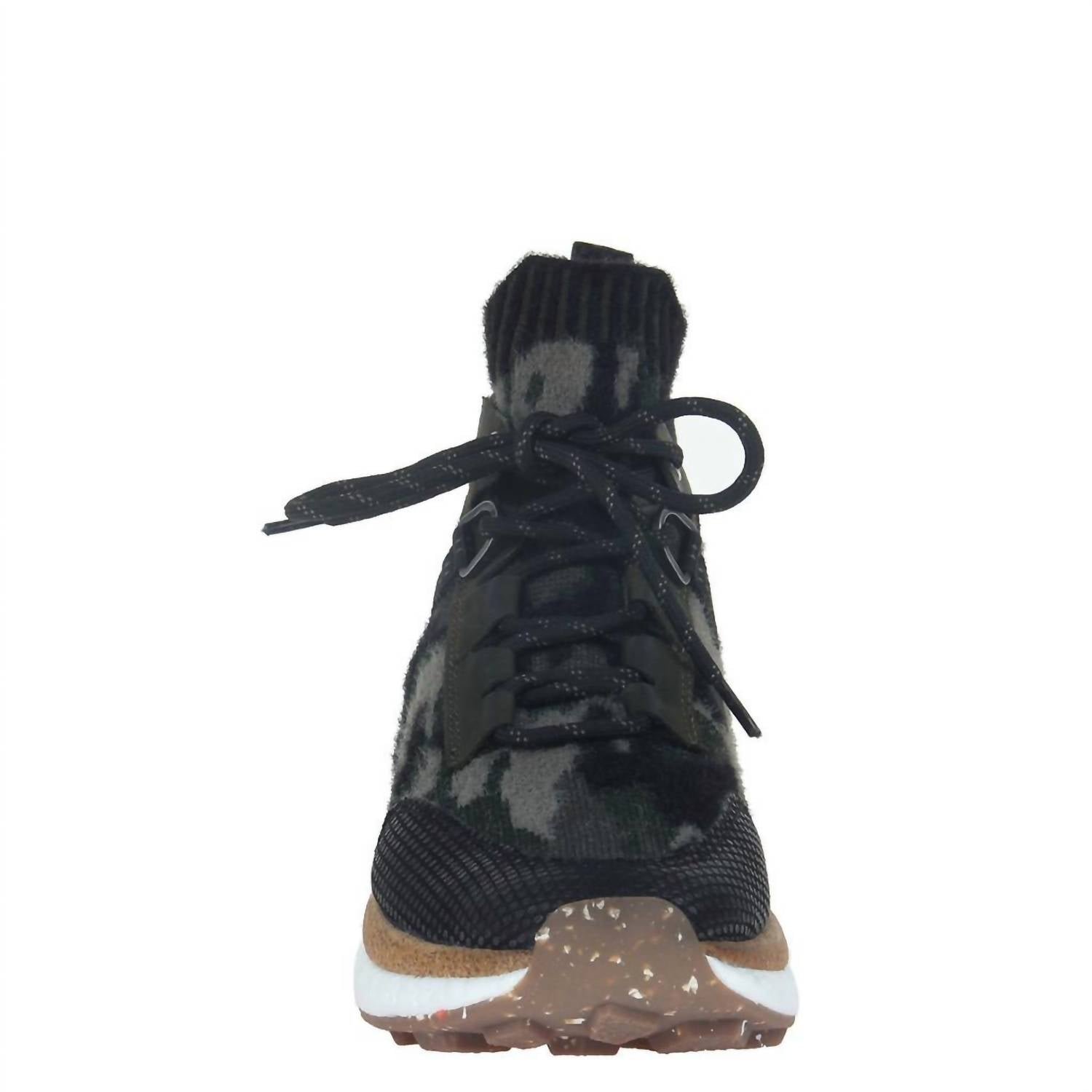 When fashion and function come together seamlessly.Introducing the Women's Hybrid Print Sneakers by OTBT, crafted with a breathable stretch knit and a wild mix of leathers and prints. These sneakers feature a soft sock-like high top, a round toe, and a sporty outdoor utility style. Engineered for ultimate comfort with Travel Lite Step Lite foam and a removable EVA footbed, they boast a 1.77' platform heel and a 1.1' platform. Originating from China, they slip on easily with bicolor hiker laces and a recycled rubber lug sole, perfect for adventurous fall outings.