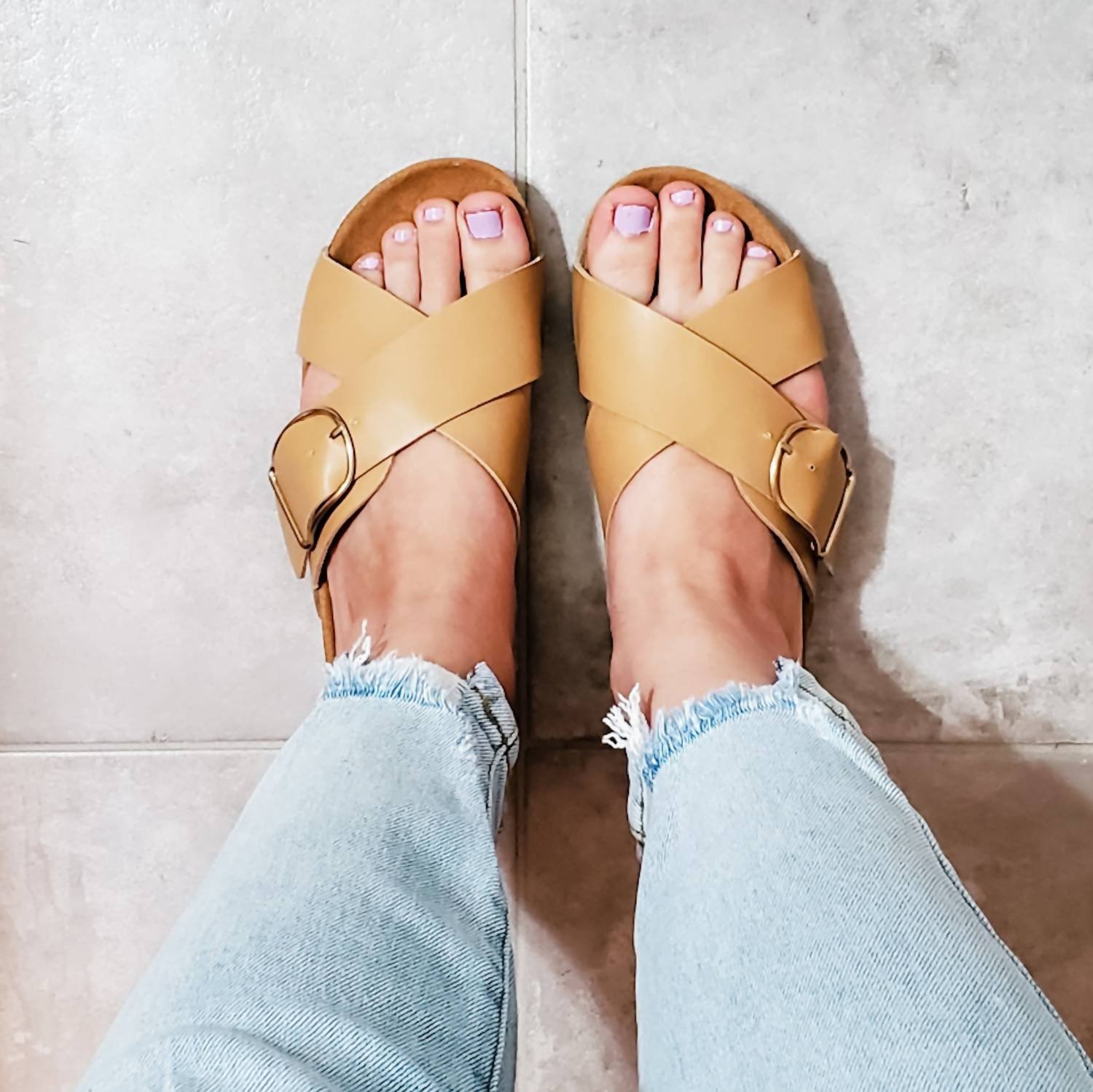 This sandal will take you from brunch to dinner and everything in between.Elevate your summer style with the Women's Buckle X-Band Slip-On Sandals by Qupid, crafted from faux leather in a versatile tan hue. These sandals showcase a chic crisscross design with an adjustable buckle for a secure fit. Featuring an open toe shape perfect for beach days, they provide comfort with a soft suede insole and sturdy rubber bottom. Slip them on effortlessly to complete your laid-back, luxurious look.