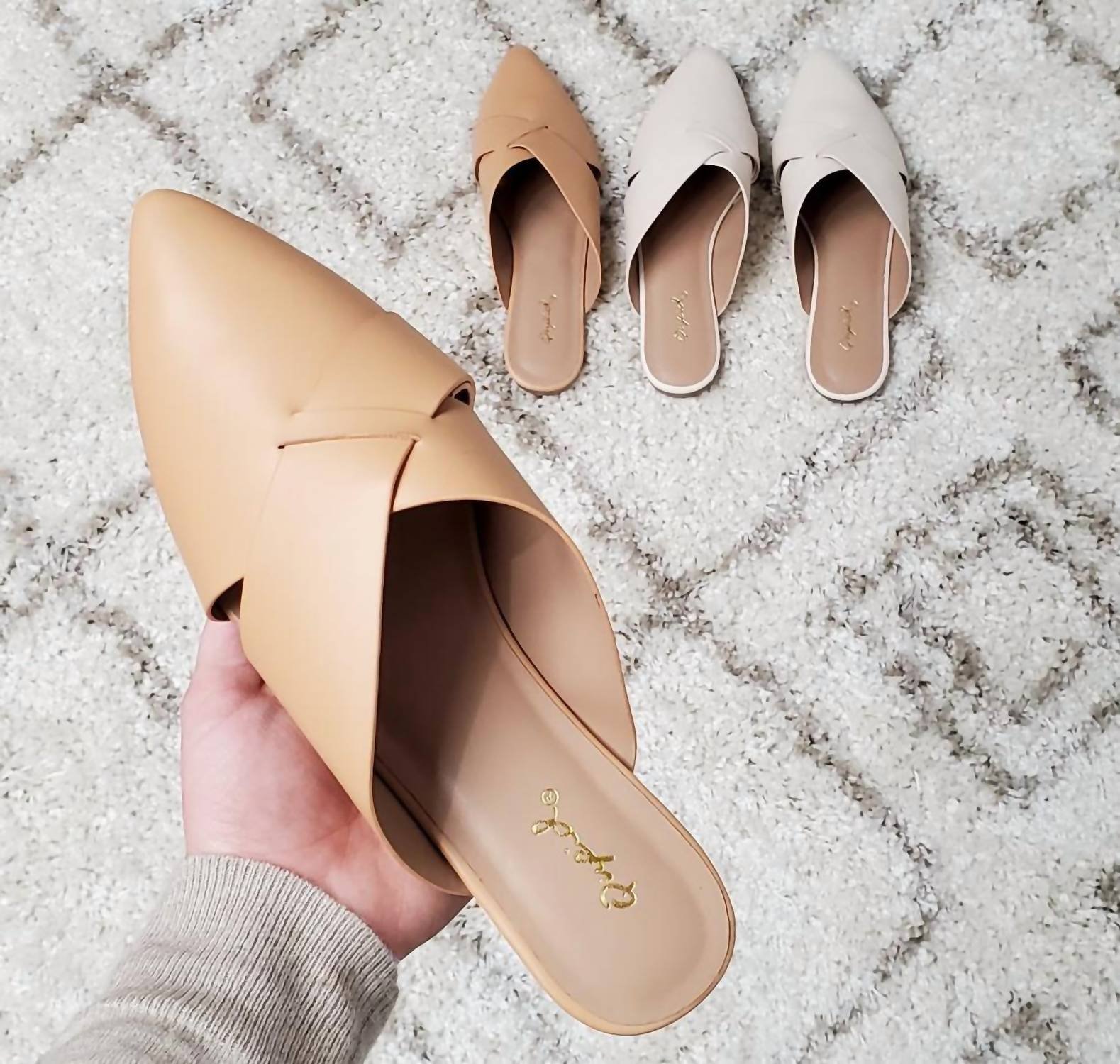 Loafers so versatile you can wear them with just about anything.Step into elegance with the Women's Swirl Ballerina Mules by Qupid, perfect for showcasing a sophisticated flair. These flats feature a pointed toe and chic mule silhouette, crafted from smooth faux leather in a soft sand shade. Designed for versatility, these slip-ons are ideal for work and weekends, enhanced with a swirl detail for a subtle touch of elegance. With a durable rubber bottom, they offer style and cruelty-free comfort for all-day wear.