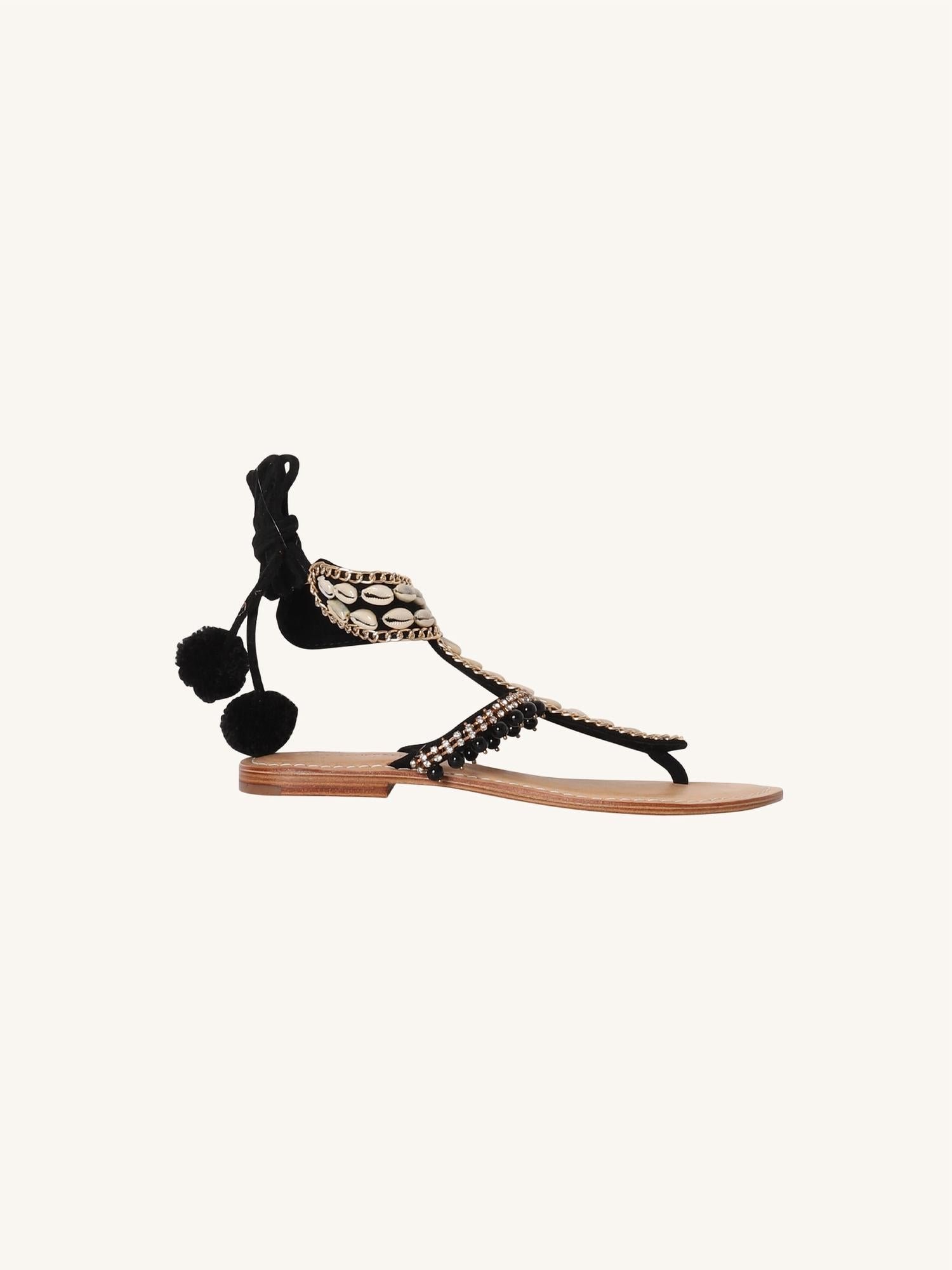 A preppy yet feminine take on the classic loafer.Step out in style with the Silvia Tcherassi Vechiano Flat Sandals, a stunning blend of intricate beaded elements and bohemian shells. These sandals feature wrap-around laces adorned with playful pom-poms, ideal for transitioning effortlessly from the beach to a dinner outing. Designed with a round toe and flat heel, these sandals come in a chic white and black combination. Crafted for women and fitting true to size, they're perfect for the modern fashionista seeking both comfort and elegance.
