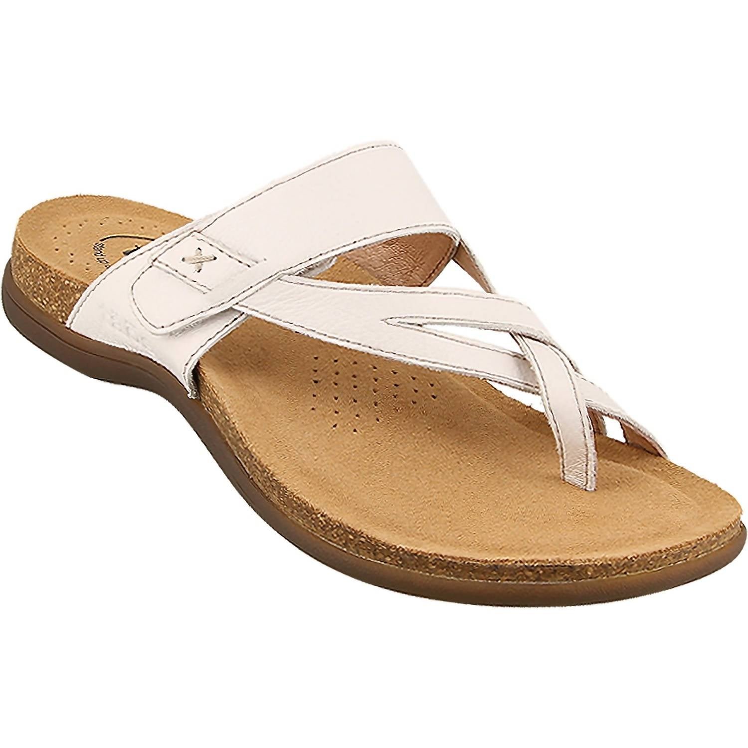 Flowy dresses, cropped pants, and even jumpsuits... this sandal works with them all!Step into all-day comfort with the Taos Perfect Leather Casual Sandals, ideal for any summer adventure. These stylish white leather thong sandals feature an adjustable strap and a premium microfiber footbed lining for ultimate softness. Enhanced with arch and metatarsal support, the molded, contoured polyurethane insole is covered with Cool Recovery Foam, while the flexible rubber outsole ensures durability. With a heel height of 0.75 inches, these sandals boast a convenient hook and loop closure, offering the perfect fit for every step.