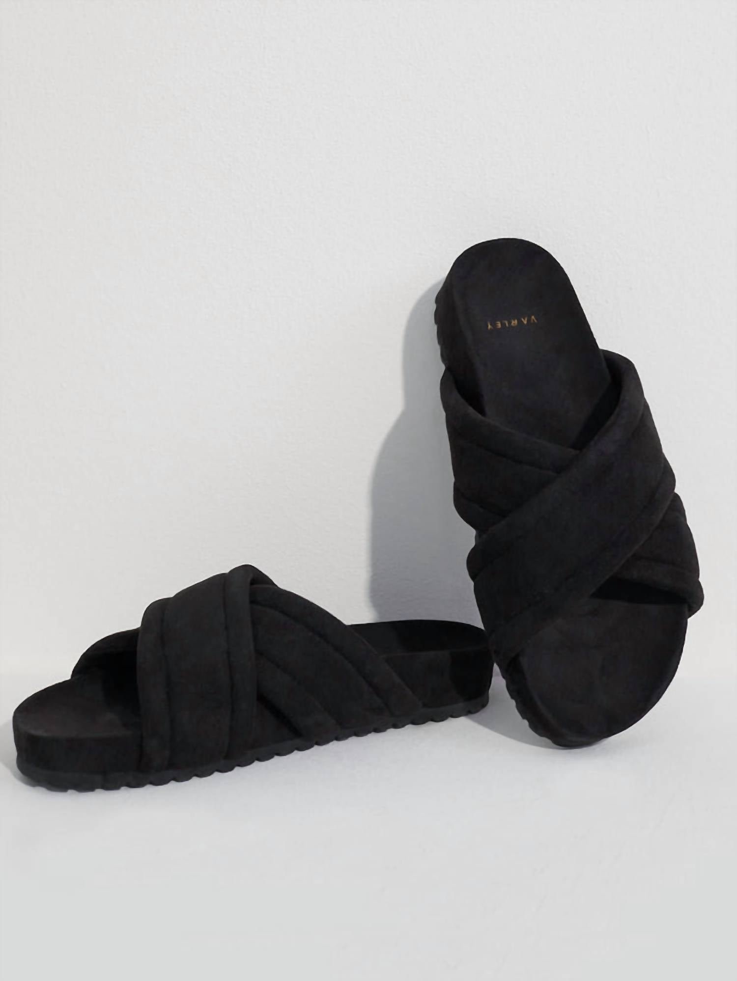 This sandal will take you from brunch to dinner and everything in between.True to size. Made from plush faux suede with a contemporary footbed and cushioned, crossover straps. Main: 100% Polyester, Sponge: 100% PVC, Outsole: 100% TPR.